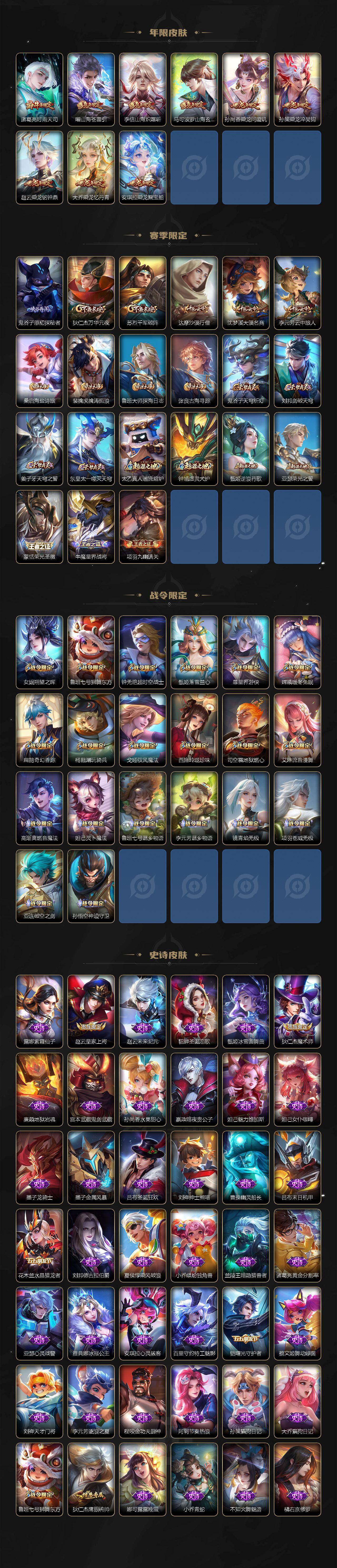 【传说皮肤】:桑启鸣野蒿,铠冥王哈迪斯,亚连落雪白狼,典韦战鼓燎原,孙尚香乘龙问璇玑,孙策乘龙淬吴钩,赵云乘龙铭钟鼎,马超琥珀纪元,澜逐花归海,云缨鹤归松栖,澜电玩雷克斯,曜山海苍雷引,李信山海炽霜斩,李白诗剑行,赵云淬星耀世,诸葛亮时雨天司,铠绛天战甲,虞姬启明星使,虞姬云霓雀翎,宫本武藏地狱之眼
