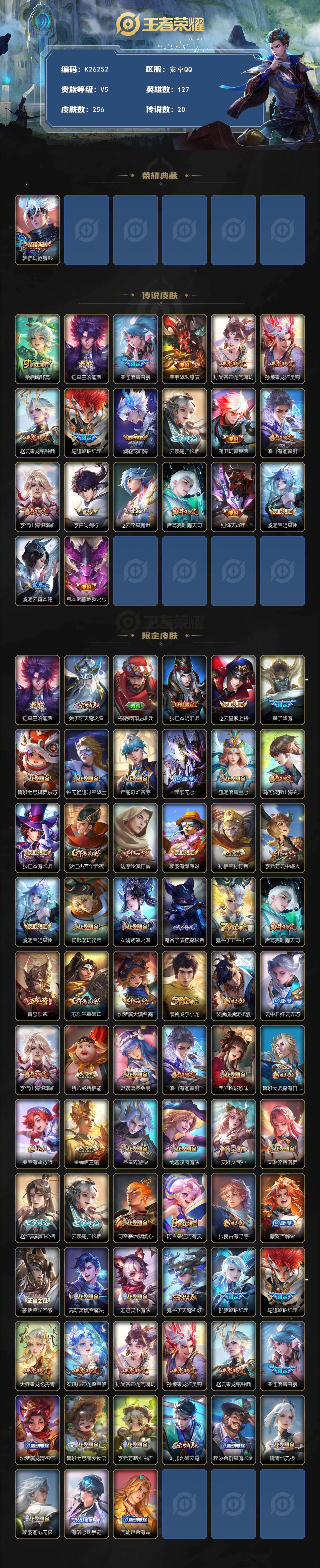 安卓Q-V5-永恒钻石III段位-127英雄-256皮肤-1典藏皮肤-20传说-78史诗