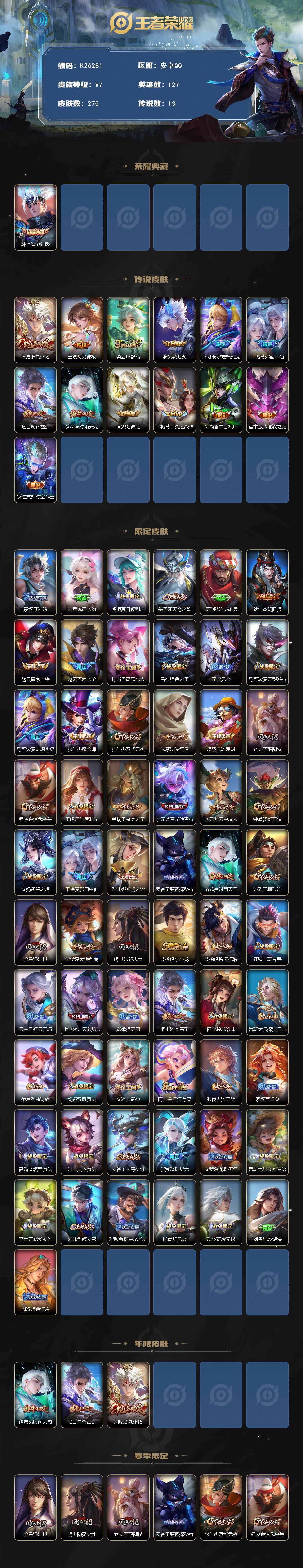 安卓Q-V7-永恒钻石V段位-127英雄-275皮肤-1典藏皮肤-13传说-67史诗