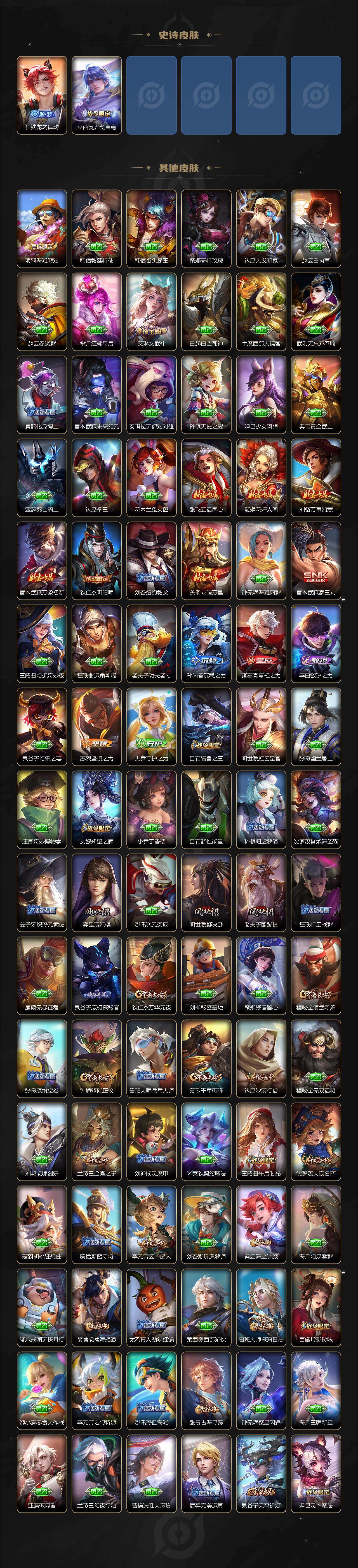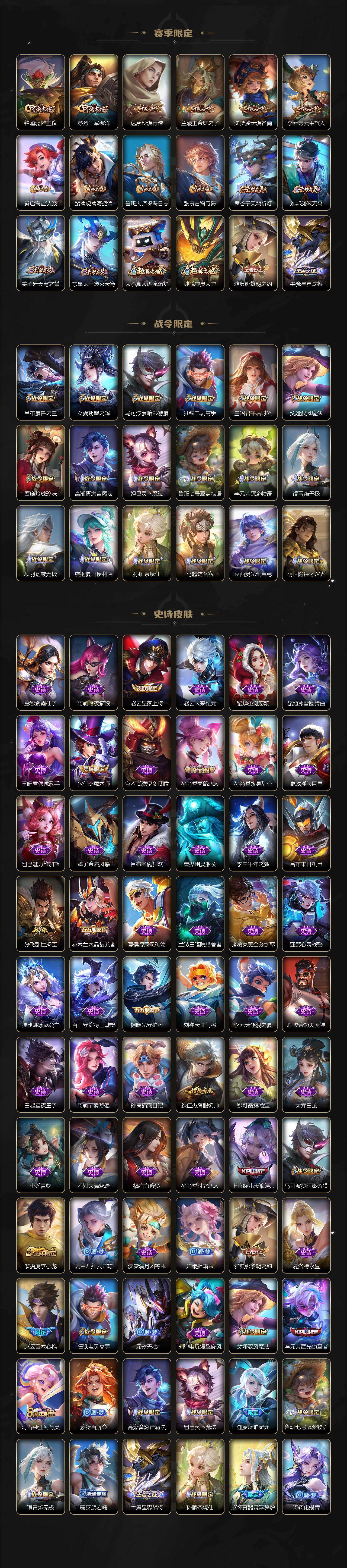 【限定皮肤】:蒙犽顽岩魄,大乔绒语心约,虞姬夏日便利店,姜子牙天穹之誓,杨戬破阵退雄兵,狄仁杰阴阳师,赵云皇家上将,赵云百木心枪,孙尚香蔷薇恋人,吕布猎