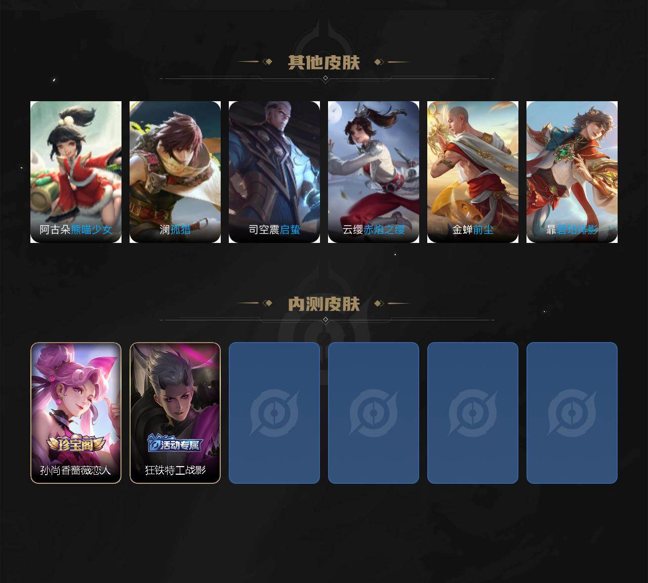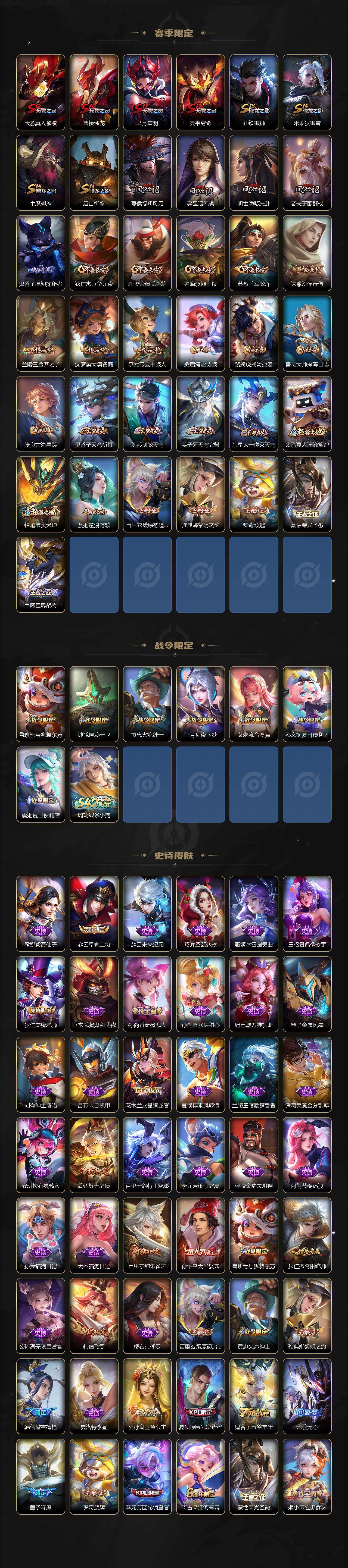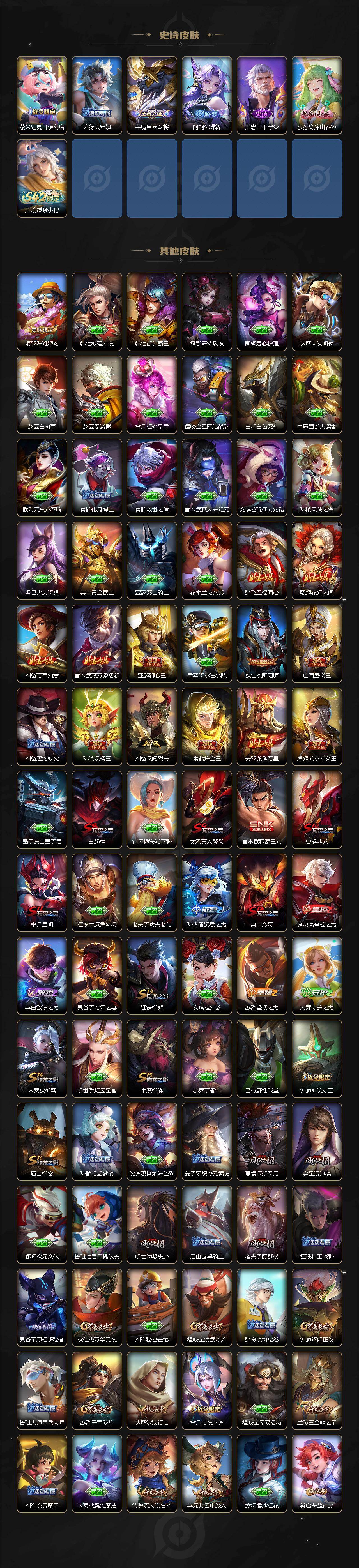 【限定皮肤】:白起狰,蒙犽顽岩魄,蔡文姬夏日便利店,虞姬夏日便利店,姜子牙天穹之誓,狄仁杰阴阳师,虞姬凯尔特女王,赵云皇家上将,墨子降魔,孙尚香蔷薇恋人,鲁