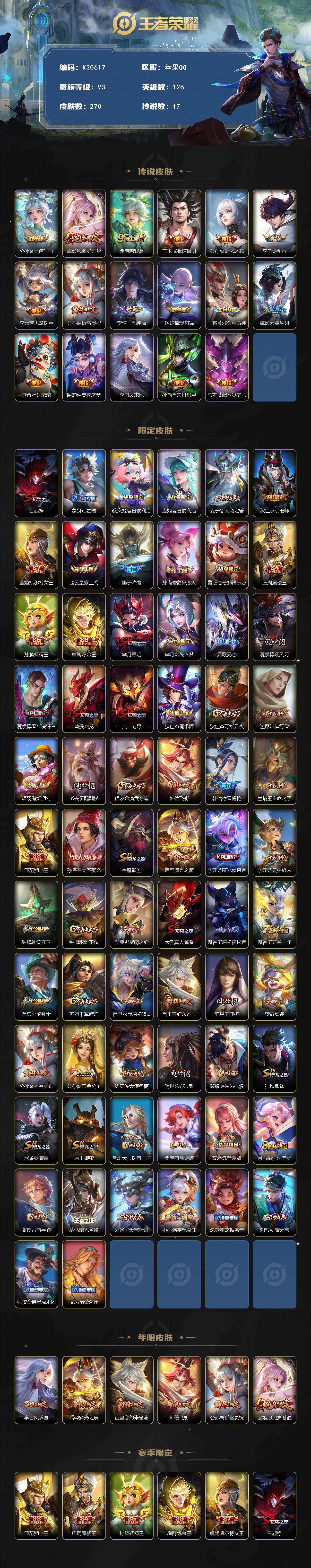 苹果Q-V3-至尊星耀I段位-126英雄-270皮肤-17传说-54史诗