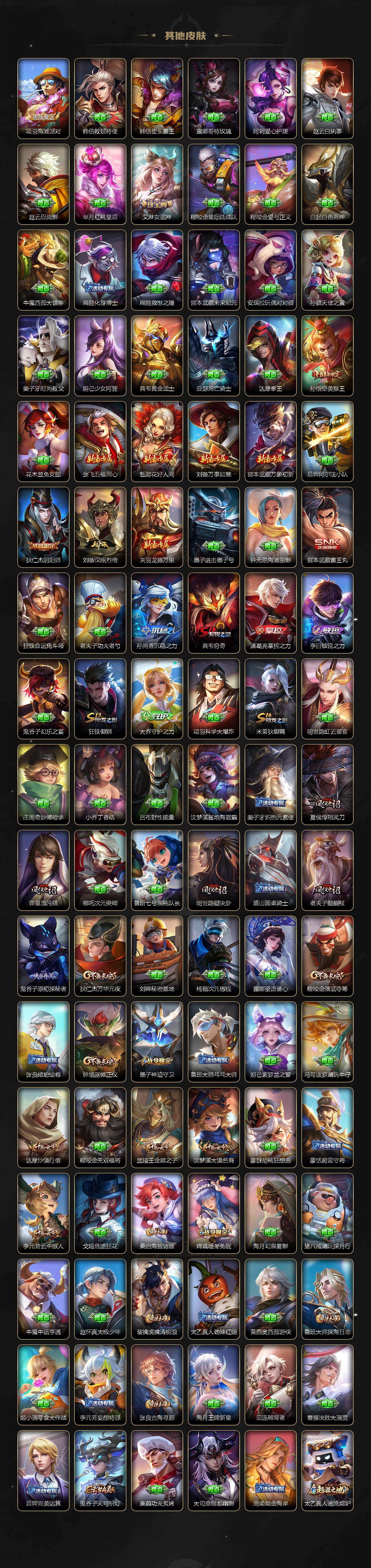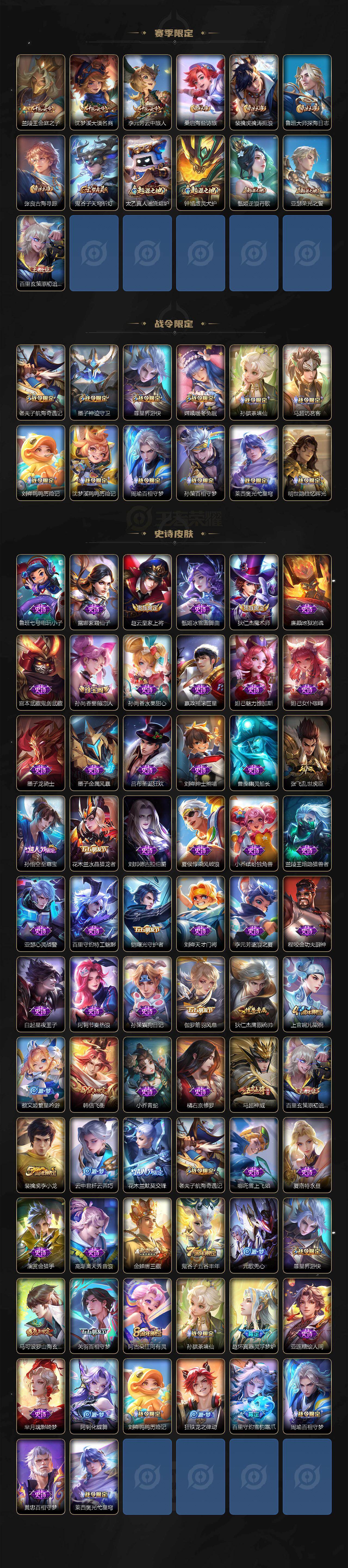 【传说皮肤】:大司命死亡执政官,公孙离云诺千山,澜愿照九州拓,澜逐花归海,诸葛亮鹤羽星尊,夏洛特浮生妄,花木兰燃星之曲,吕布怒海麟威,橘右京枫霜尽,马可波罗深海之息,裴擒虎寅虎赤拳,镜炽阳神光,虞姬启明星使,曜云鹰飞将,花木兰冠军飞将,孙尚香末日机甲,孙悟空地狱火