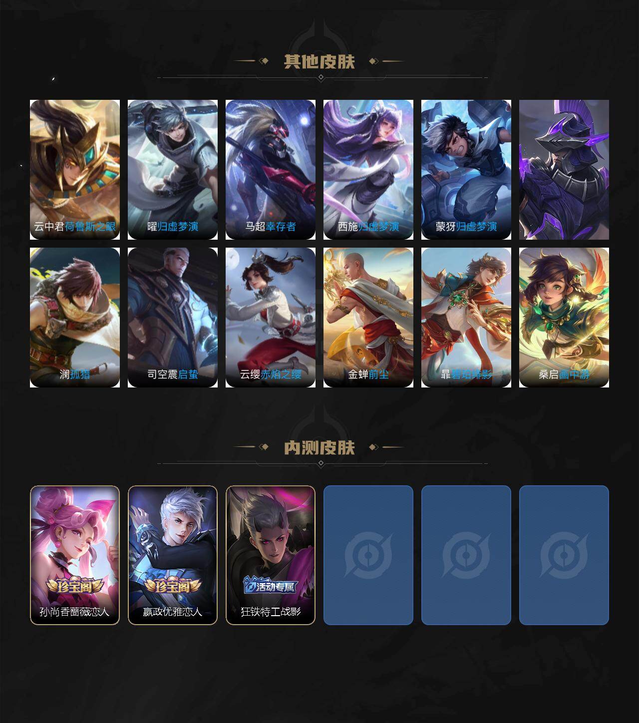 【传说皮肤】:后羿神树通天,桑启鸣野蒿,吕布曦玄引,孙策乘龙淬吴钩,李信山海炽霜斩,女娲补天,赵云淬星耀世,镜炽阳神光,曜云鹰飞将,李信一念神魔,诸葛亮武陵仙君,貂蝉仲夏夜之梦,吕布天魔缭乱