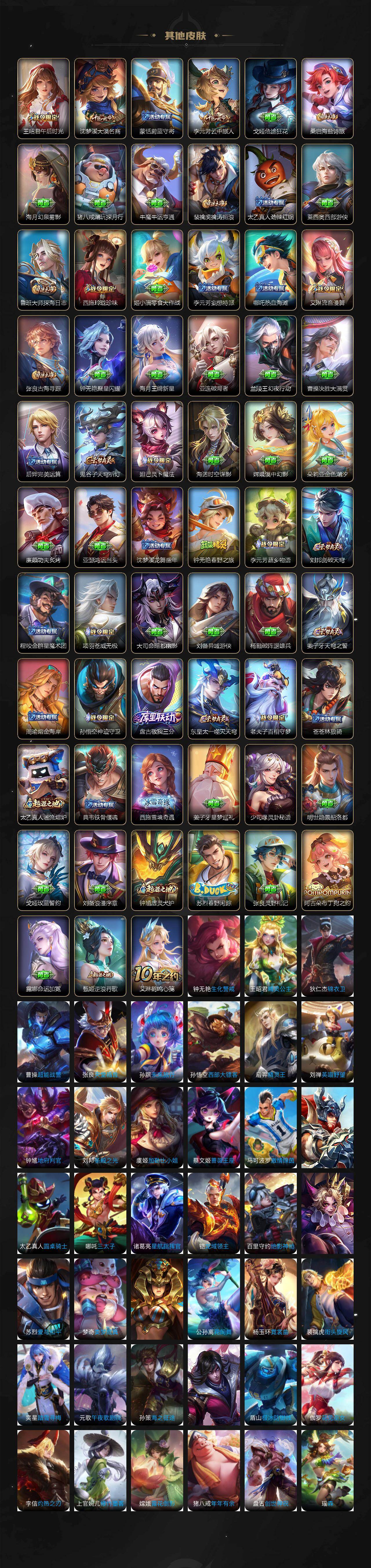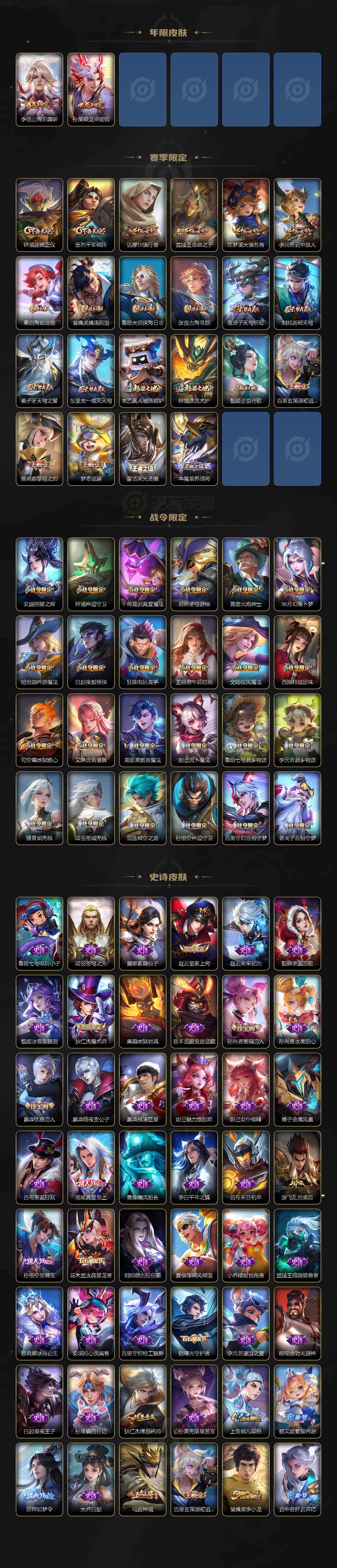【限定皮肤】:姜子牙天穹之誓,杨戬破阵退雄兵,狄仁杰阴阳师,赵云皇家上将,嬴政优雅恋人,孙尚香蔷薇恋人,庄周高山流水,高渐离死亡摇滚,白起夜都怪侠,芈月白晶晶,芈月幻