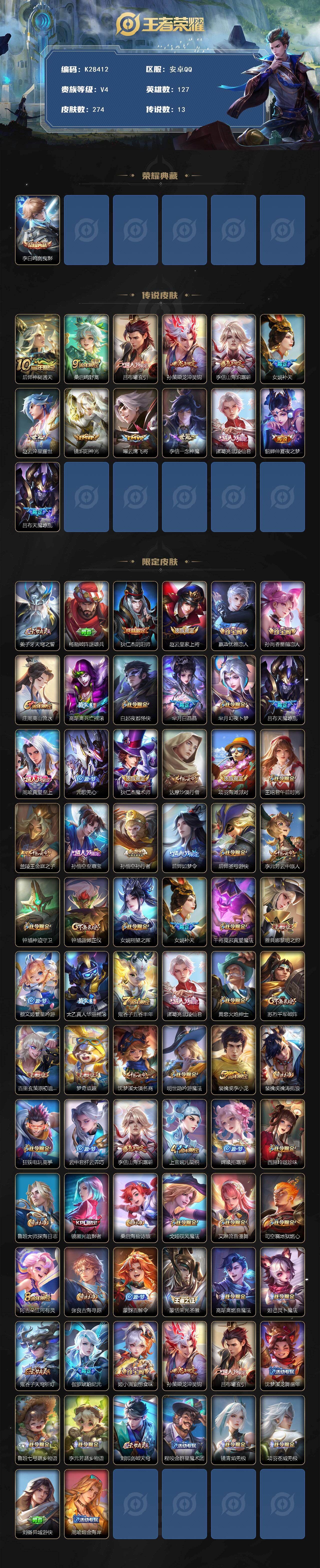 安卓Q-V4-永恒钻石III段位-127英雄-274皮肤-1典藏皮肤-13传说-