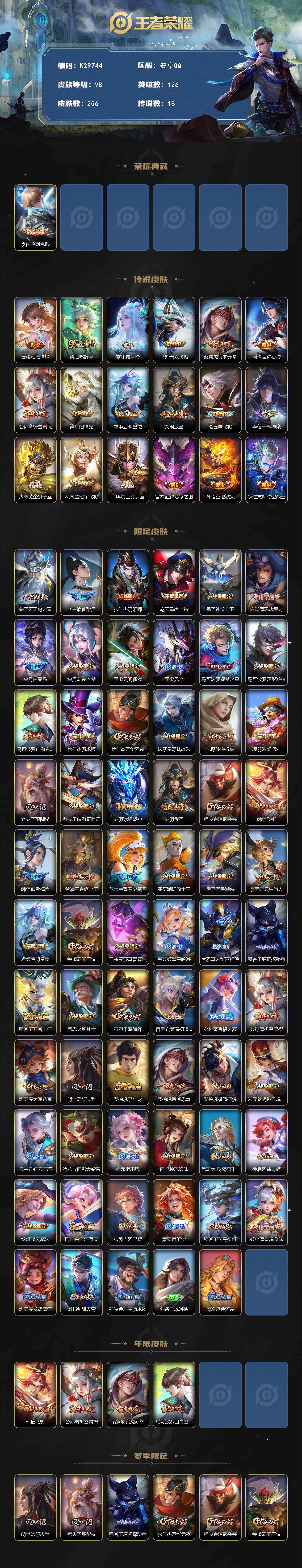 安卓Q-V8-永恒钻石II段位-126英雄-256皮肤-1典藏皮肤-18传说-62史诗