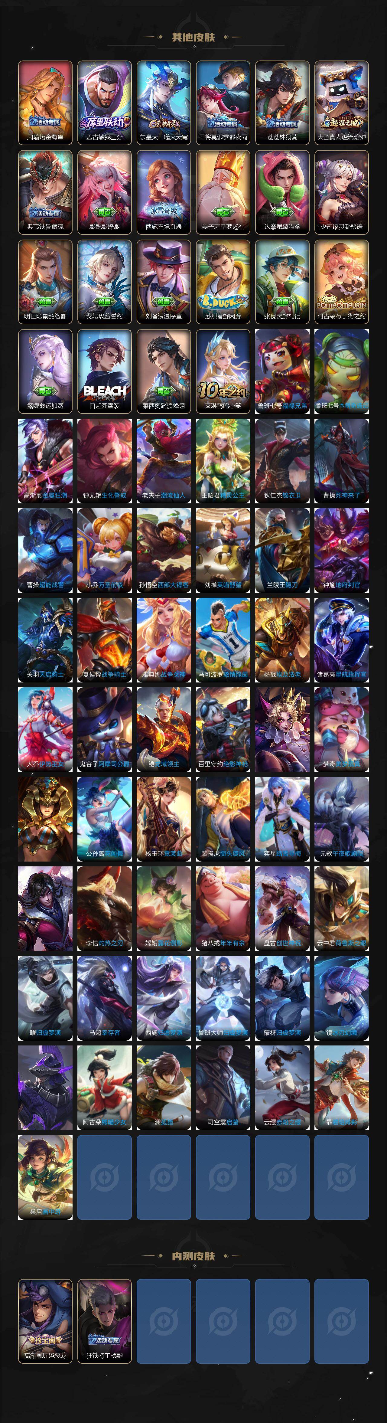 【传说皮肤】:云缨幻光神枪,桑启鸣野蒿,露娜霜月吟,马超无双飞将,裴擒虎寅虎赤拳,周瑜音你心动,公孙离祈雪灵祝,镜炽阳神光,虞姬启明星使,关羽武圣,曜云鹰飞将,李信一念神魔,达摩黄金狮子座,花木兰冠军飞将,后羿黄金射手座,宫本武藏地狱之眼,孙悟空地狱火,狄仁杰超时空战士