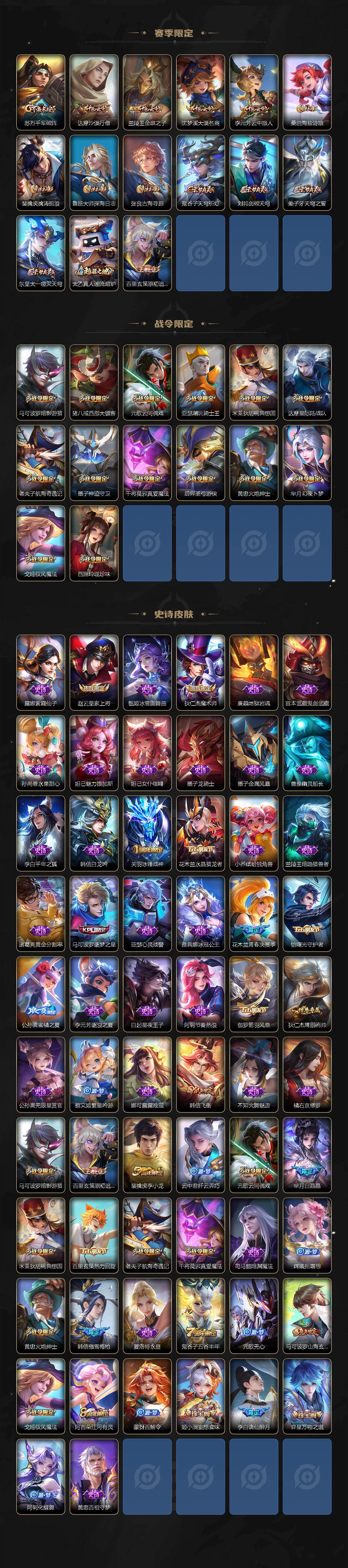 【限定皮肤】:姜子牙天穹之誓,李白谪仙醉月,狄仁杰阴阳师,赵云皇家上将,墨子神迹
