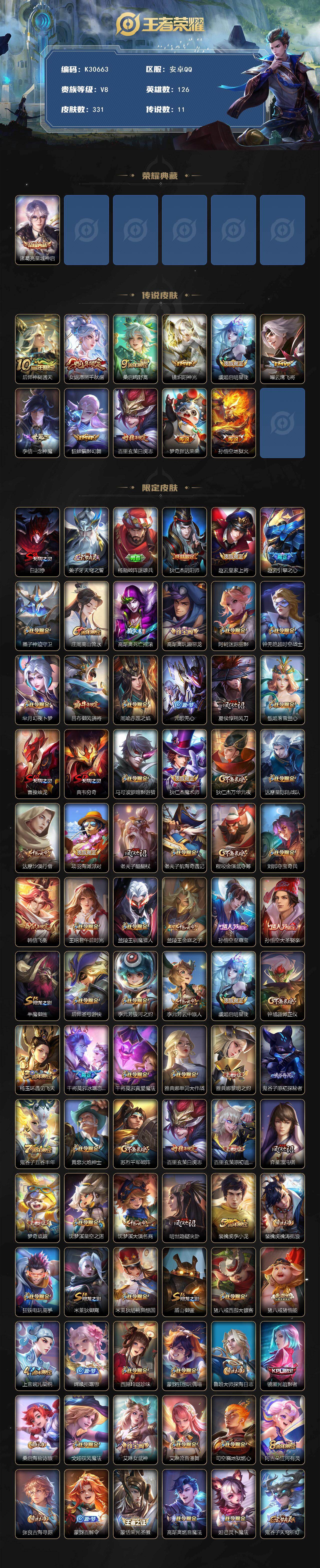安卓Q-V8-永恒钻石III段位-126英雄-331皮肤-1典藏皮肤-11传说-92史诗