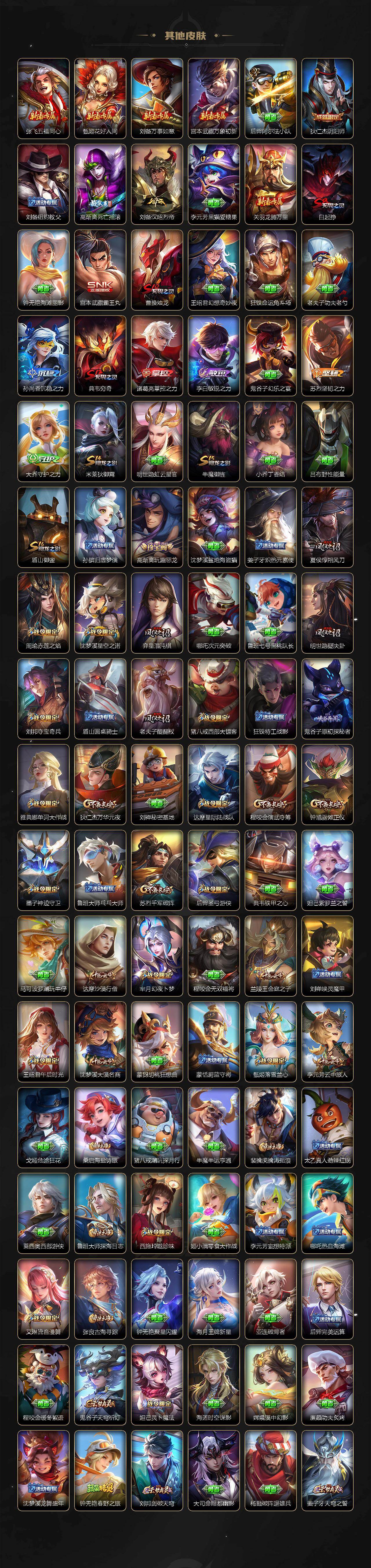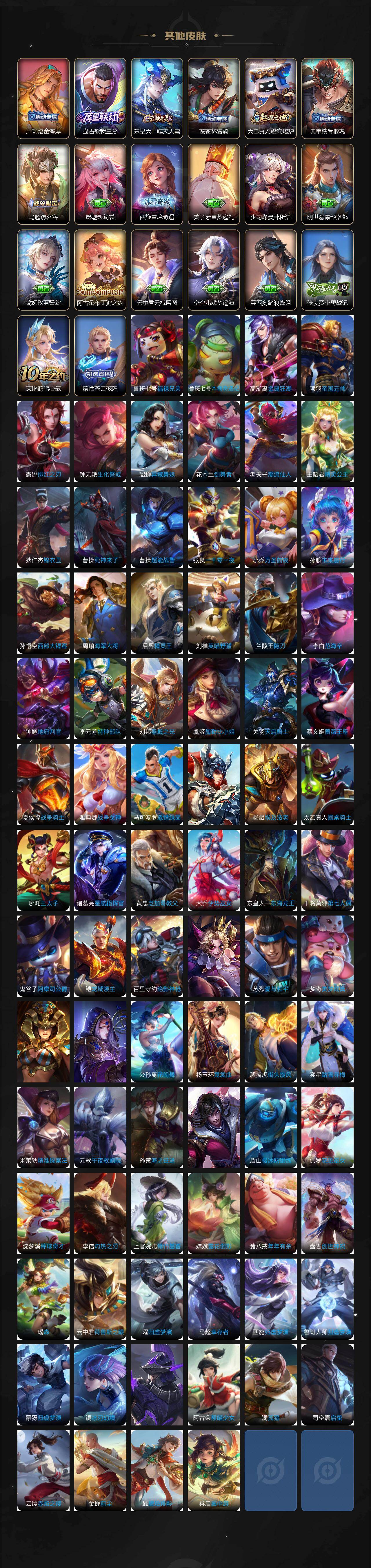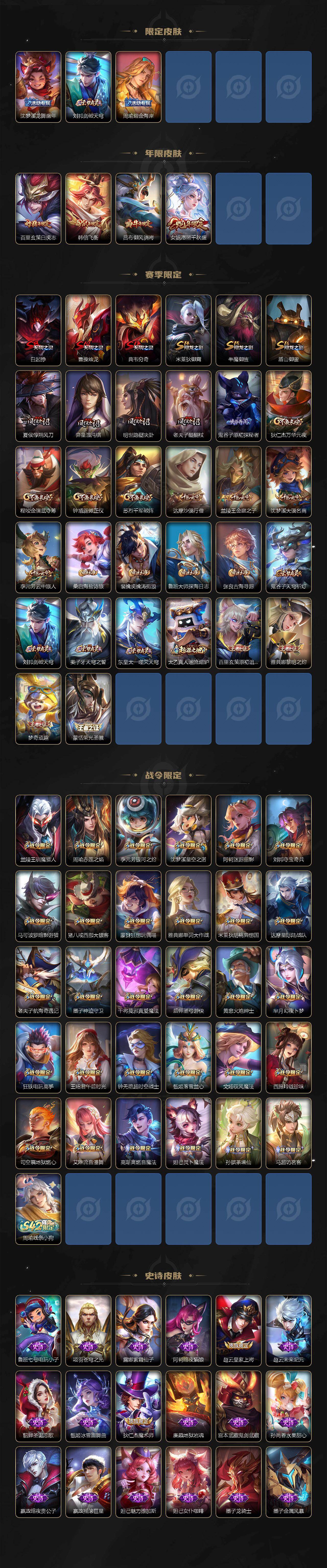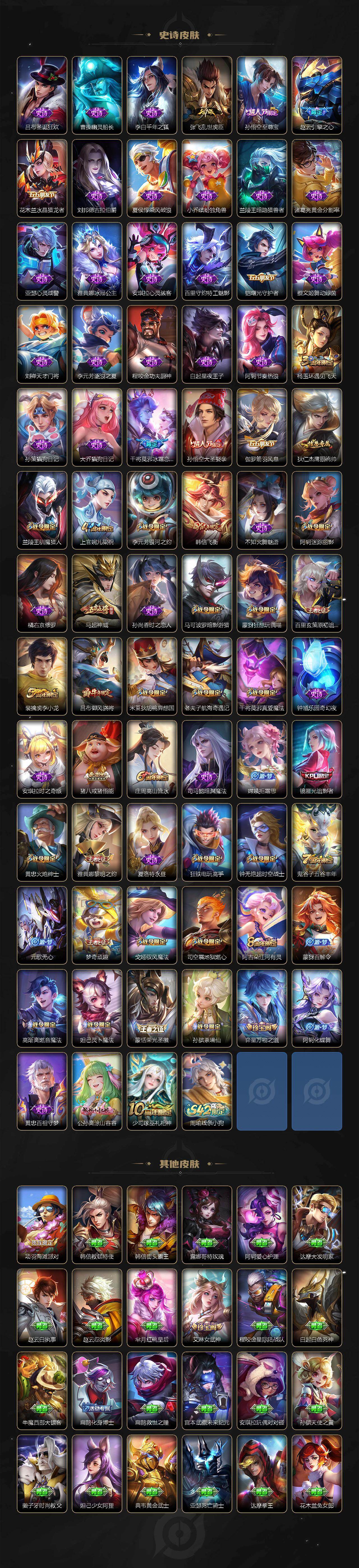 【限定皮肤】:白起狰,姜子牙天穹之誓,杨戬破阵退雄兵,狄仁杰阴阳师,赵云皇家上将,赵云引擎之心,墨子神迹守卫,庄周高山流水,高渐离死亡摇滚,高渐离玩