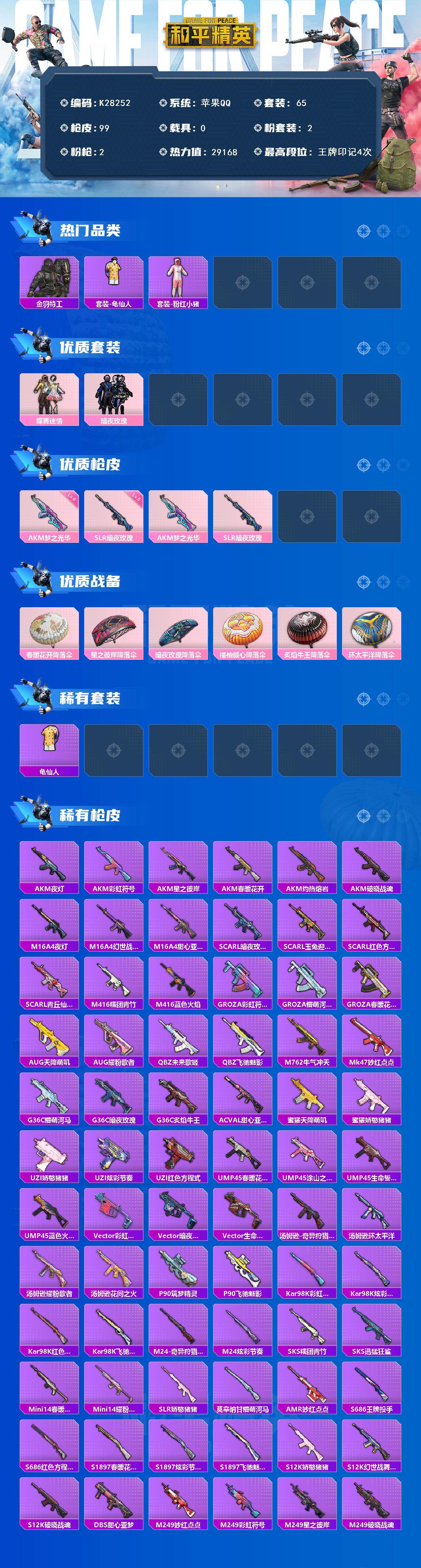 苹果 手Q-2粉装-2特效枪-0载具-0粉色飞行器-29168热力值-4王牌印记-65套装-99枪皮