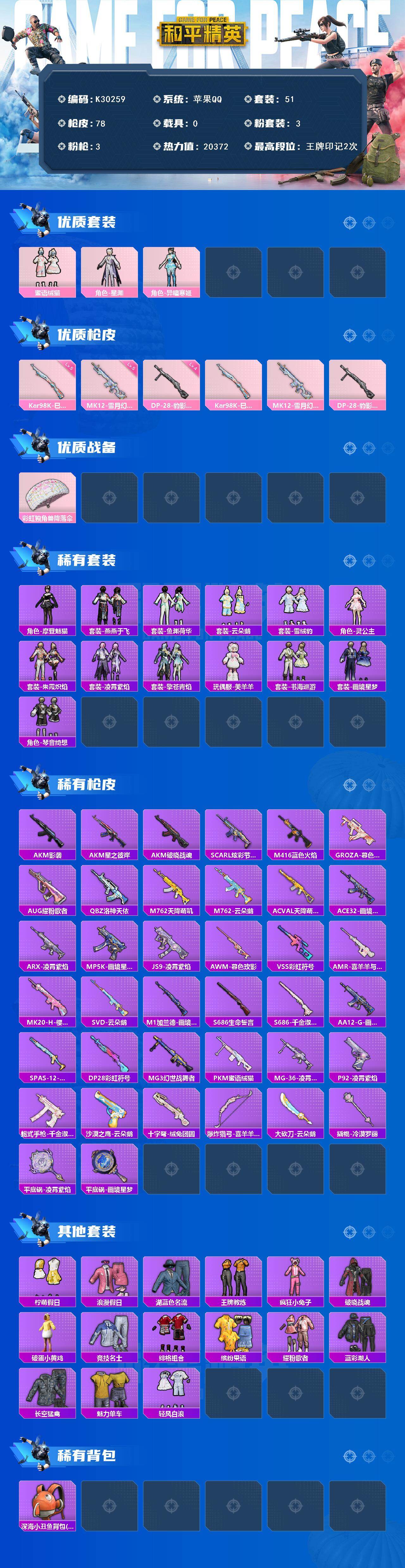 苹果 手Q-3粉装-3特效枪-0载具-0粉色飞行器-20372热力值-2王牌印记-51套装-78枪皮