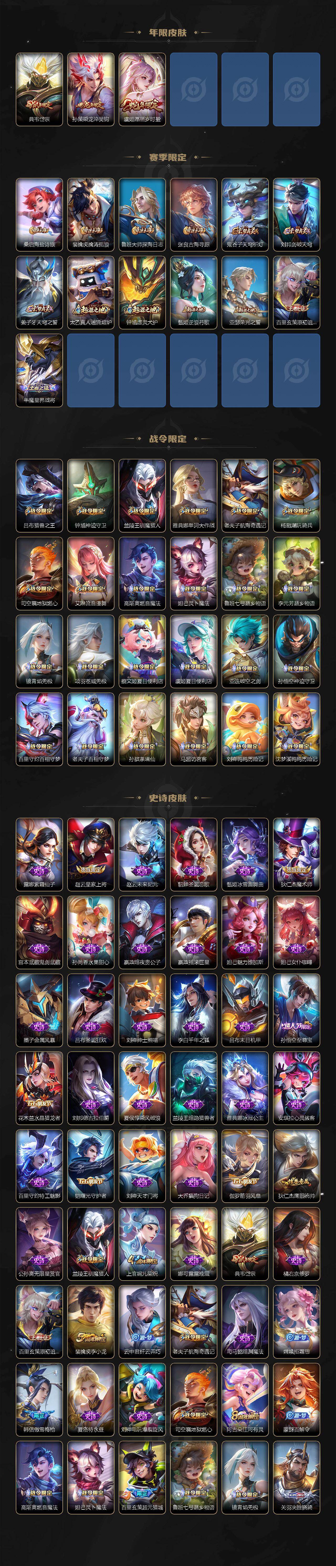 【传说皮肤】:后羿神树通天,虞姬愿照岁时盈,云缨幻光神枪,桑启鸣野蒿,亚连落雪白狼,吕布曦玄引,孙策乘龙淬吴钩,铠琥珀纪元,澜逐花归海,露娜霜月吟,吕布遇见神鼓,公孙离记忆之芯,李白诗剑行,百里守约碎云,马超无双飞将,女娲补天,镜炽阳神光,虞姬启明星使,关羽武圣,曜云鹰飞将,李信一念神魔,刘备时之恋人,干将莫