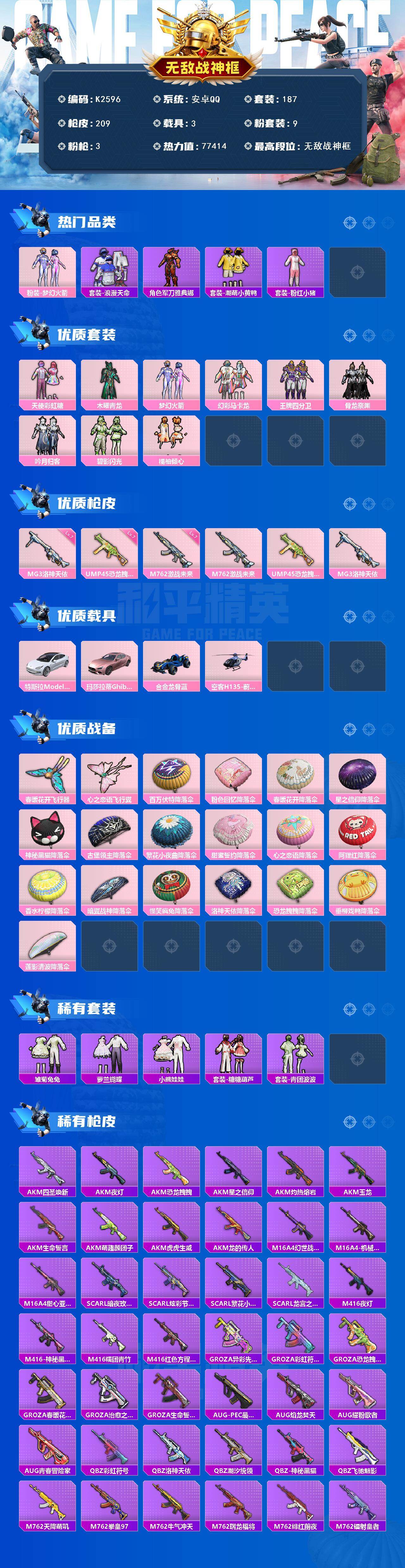 安卓 手Q-无敌战神框-9粉装-3特效枪-3载具-2粉色飞行器-77414热力值-7王牌印记-187套装-209枪皮