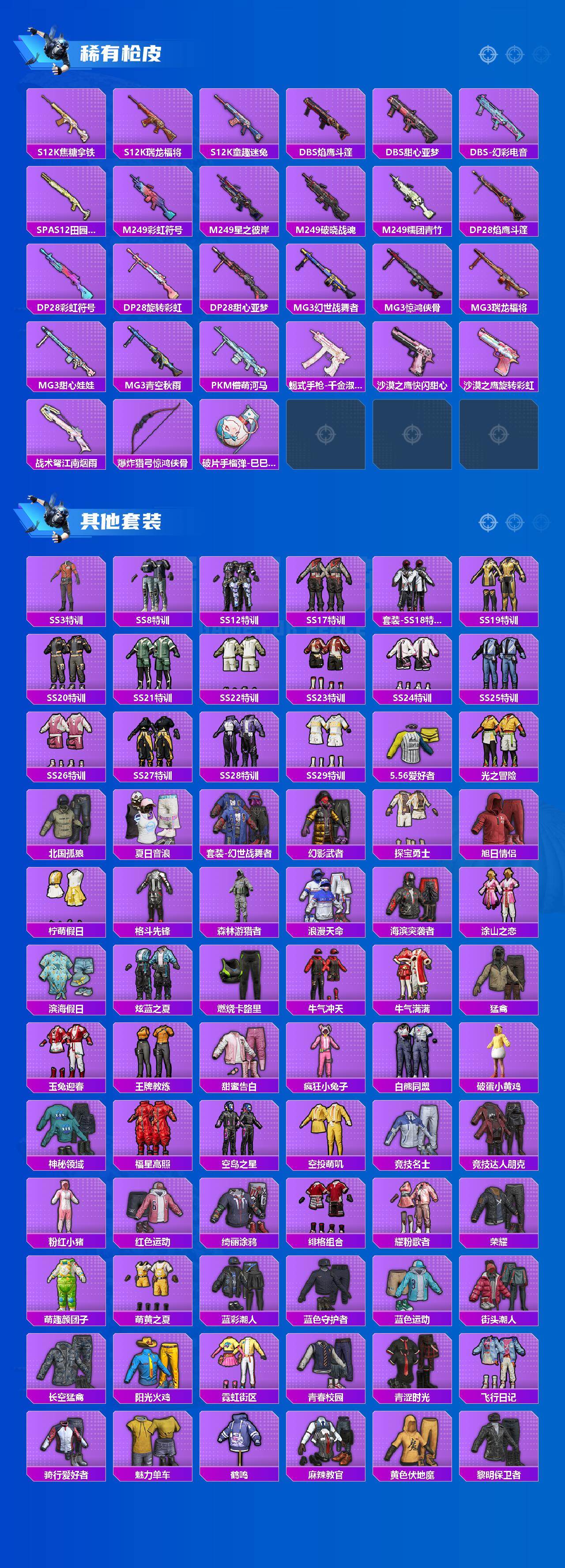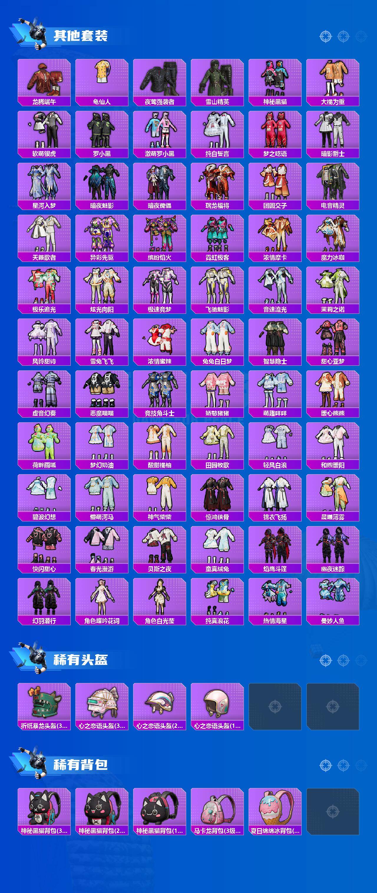 【粉色套装】:粉装-星点战士,粉装-香水柠檬,粉装-馨动时刻,粉装-山涧鹿灵,角色-洛天依,粉装-精灵娃娃,粉装-酣梦娃娃,粉装-天之羽翼,粉装-恐龙拽拽,粉装-傲雪凌霜,粉装-旋转彩虹,粉装-寒光使者,粉装-傲傲奶龙,角色-圣堂之誓,角色-引力星,角色-萨利娅