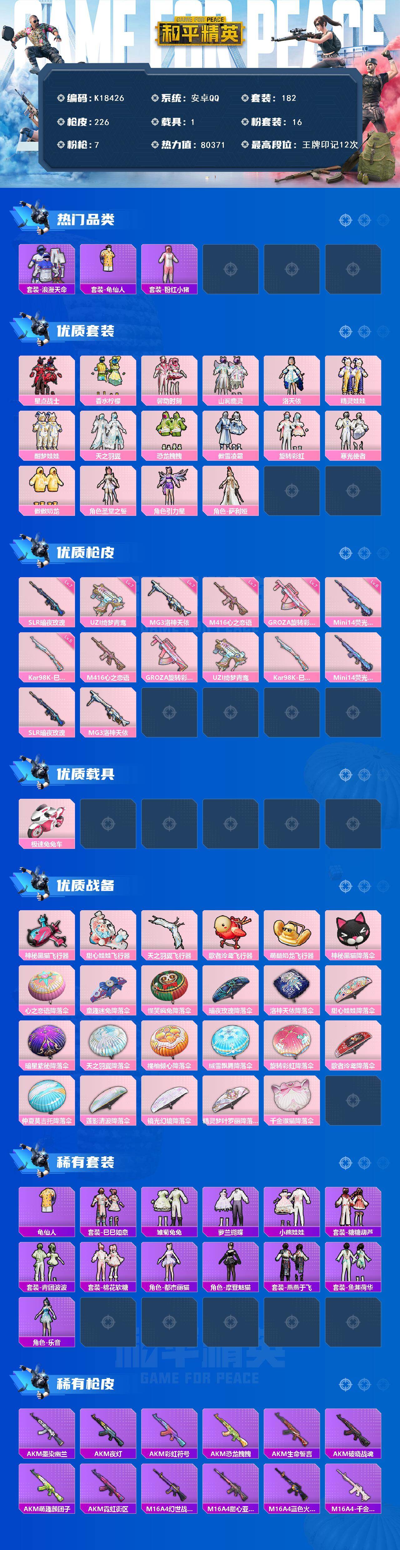 安卓 手Q-16粉装-7特效枪-1载具-5粉色飞行器-80371热力值-12王牌印记-182套装-226枪皮