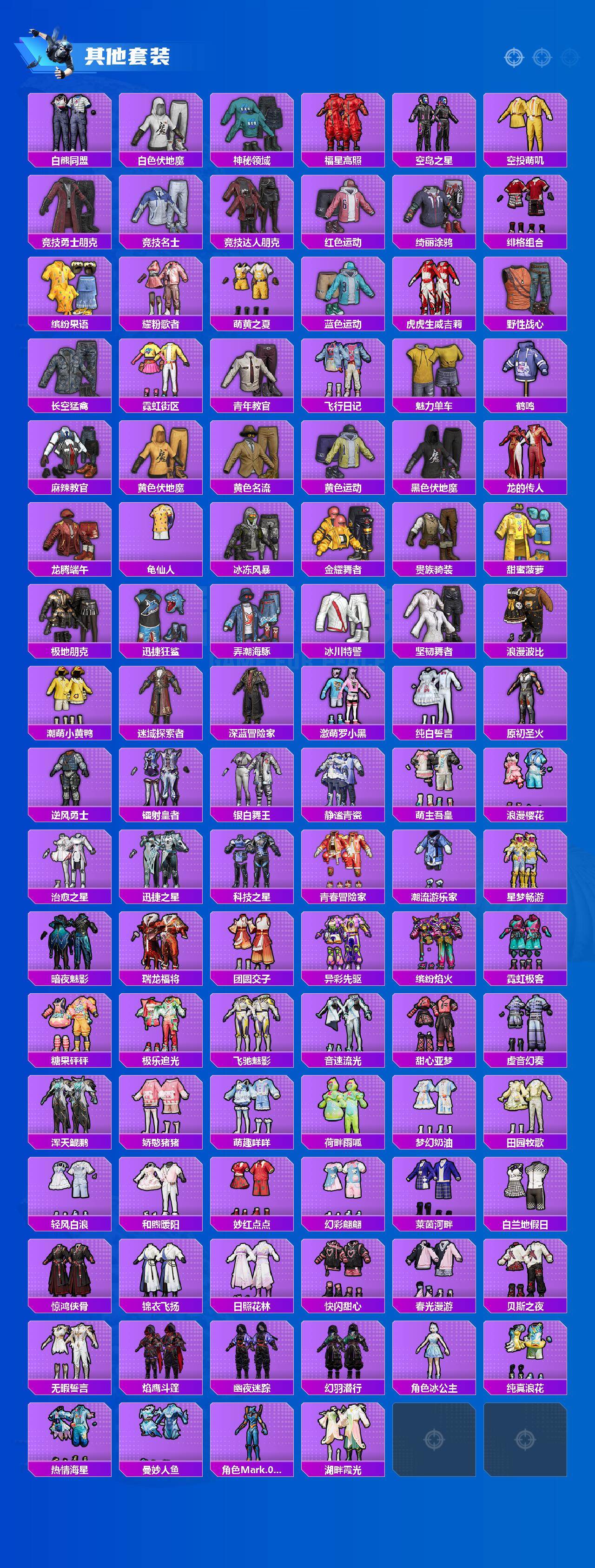 【热门品类】:粉装-梦幻火箭,套装-浪漫天命,套装-派对舞王,套装-小丑鱼,套装-胖达圆圆,套装-龟仙人,套装-潮萌小黄鸭,套装-暗影哥特,套装-浪漫波比,角色-Mark.06