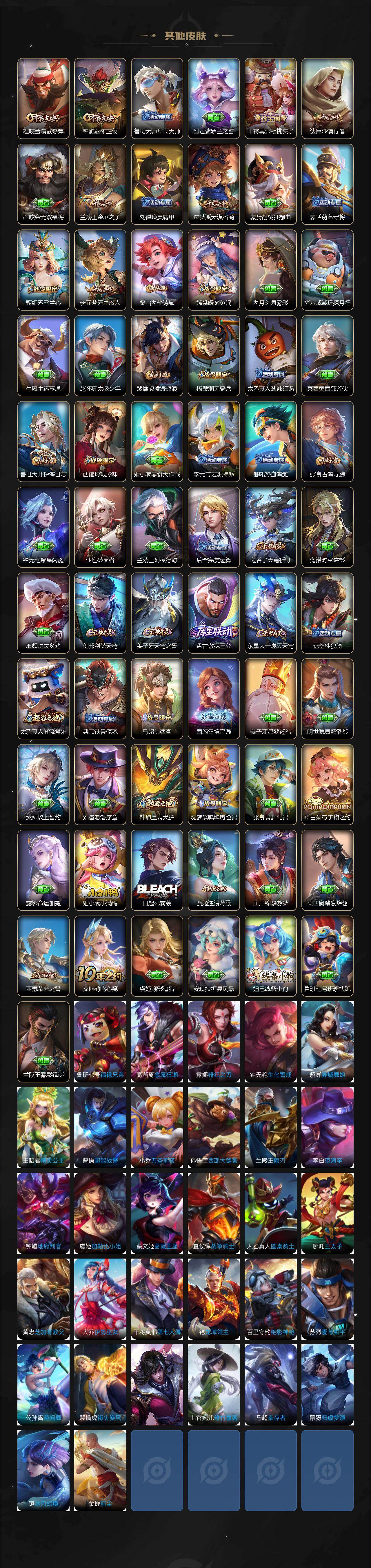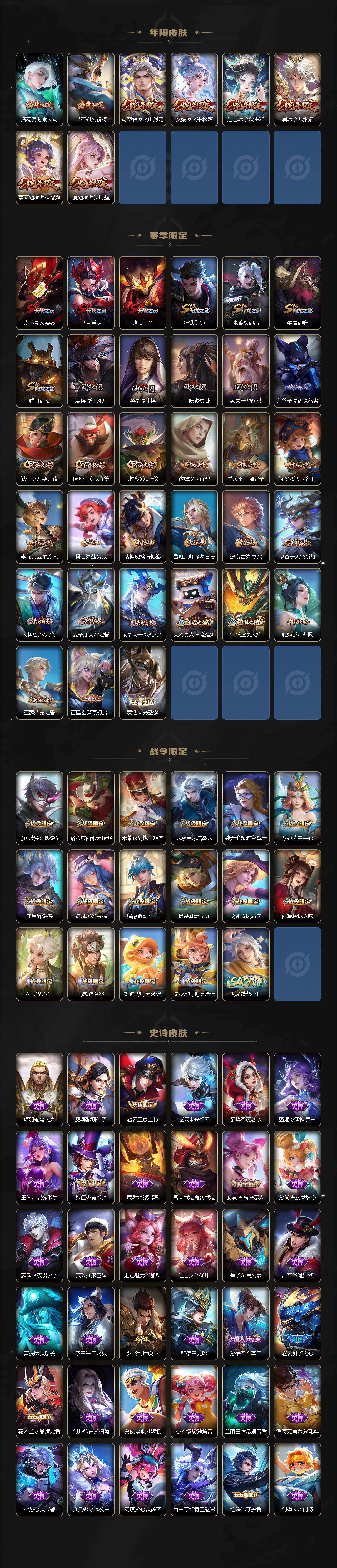 【传说皮肤】:后羿神树通天,司空震愿照山河定,女娲愿照千秋盛,妲己愿照众生和,澜愿照九州拓,蔡文姬愿照福禄聚,虞姬愿照岁时盈,桑启鸣野蒿,露娜霜月吟,上官婉儿妄想奇谈,公孙离记忆之芯,夏洛特浮生妄,李白诗剑行,马超无双飞将,诸葛亮时雨天司,镜炽阳神光,虞姬启明星使,曜云鹰飞将,干将莫邪久胜战神,后羿黄金射手座,貂蝉仲夏夜之梦,孙尚香