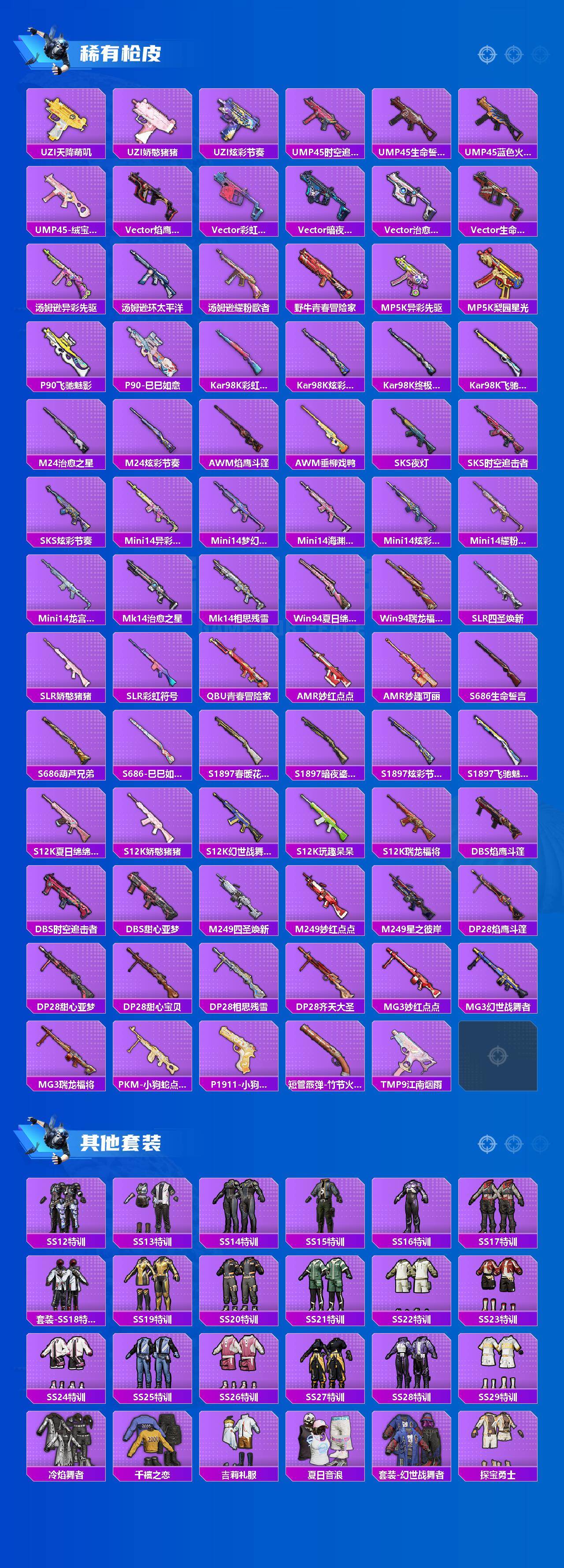 【粉色枪皮等级】:M16A4-垂柳戏鸭(二级),M416-风花雪月(七级),AUG-星之彼岸(七级),UMP45-相思残雪(七级),Kar98K-巳巳如