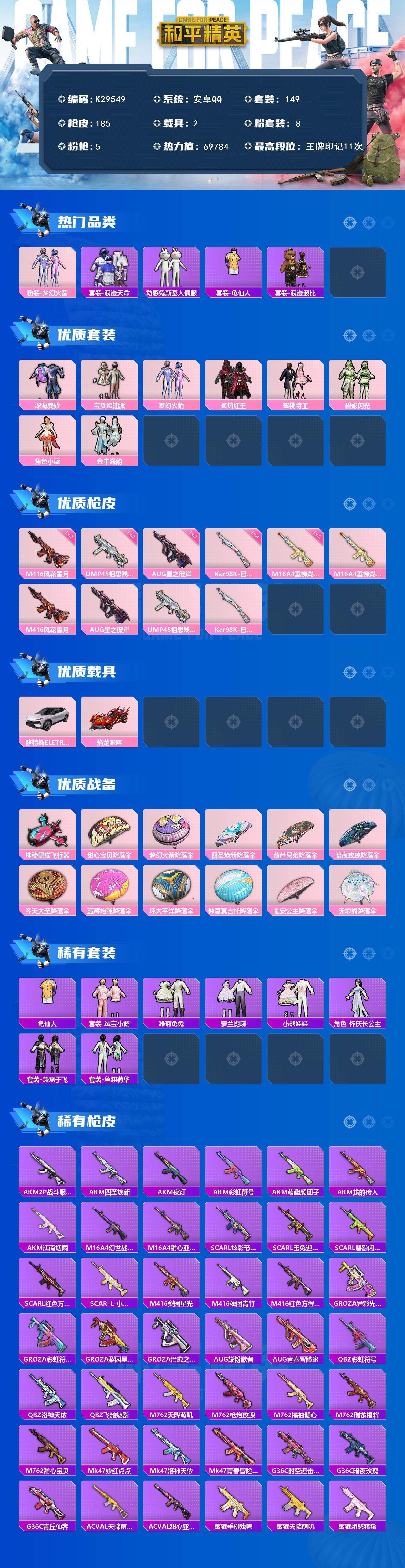 安卓 手Q-8粉装-5特效枪-2载具-1粉色飞行器-69784热力值-11王牌印记-149套装-185枪皮