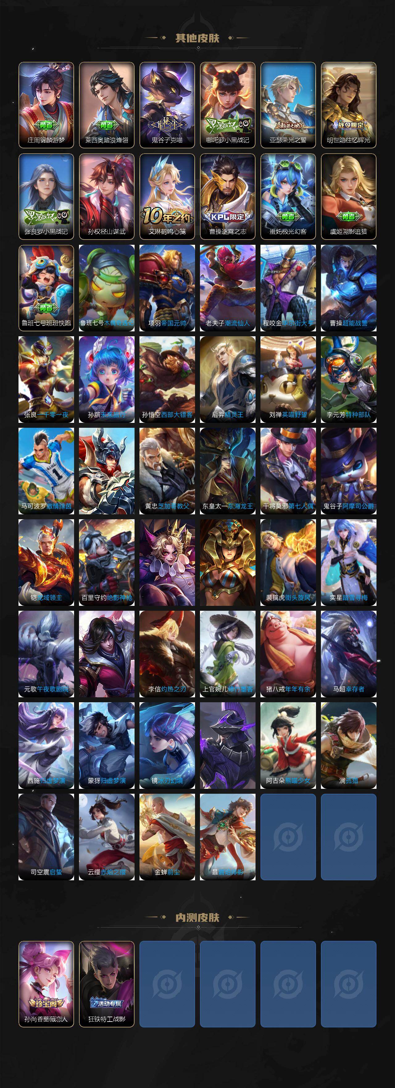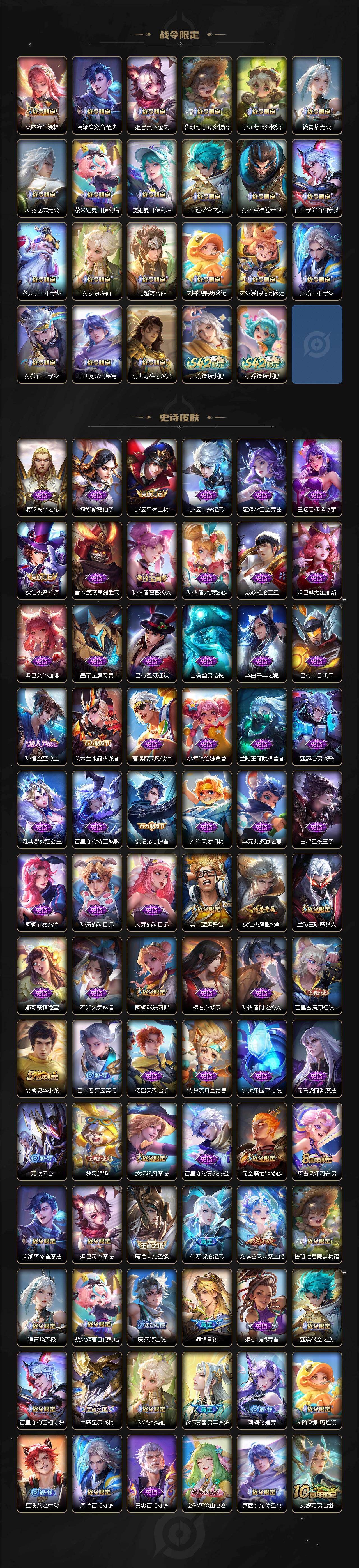 【传说皮肤】:大司命死亡执政官,司空震愿照山河定,云缨幻光神枪,桑启鸣野蒿,赵云乘龙铭钟鼎,澜逐花归海,李信山海炽霜斩,马超无双飞将,女娲补天,裴擒虎寅虎赤拳,王昭君乞巧织情,西施游龙清影,镜炽阳神光,李信一念神魔,刘备时之恋人,干将莫邪久胜战神,孙尚香末日机甲,宫本武藏地狱之眼