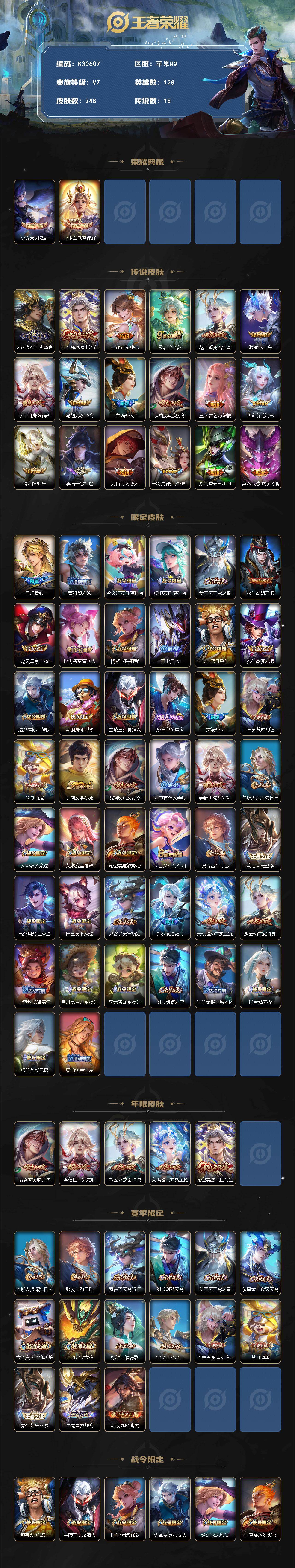 苹果Q-V7-最强王者段位-128英雄-248皮肤-2典藏皮肤-18传说-79史诗