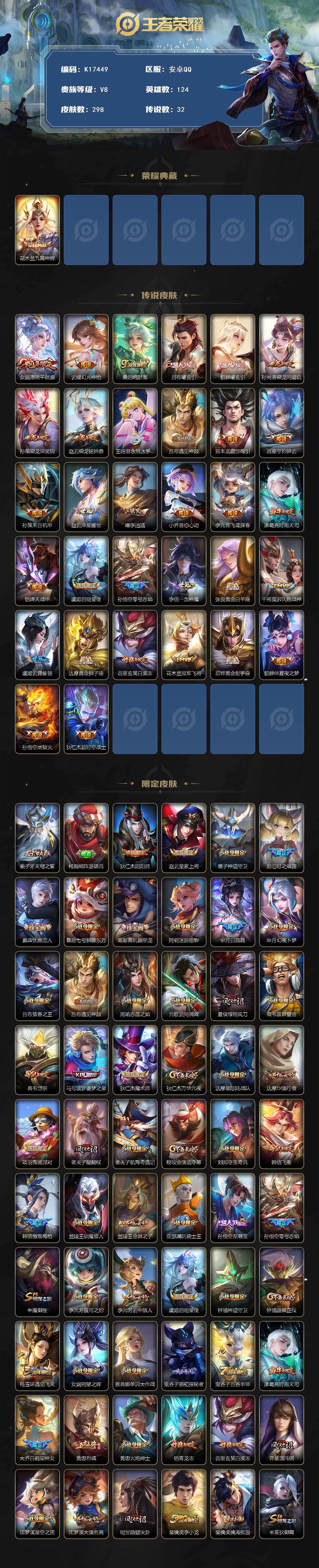 安卓Q-V8-荣耀黄金I段位-124英雄-298皮肤-1典藏皮肤-32传说-78史诗