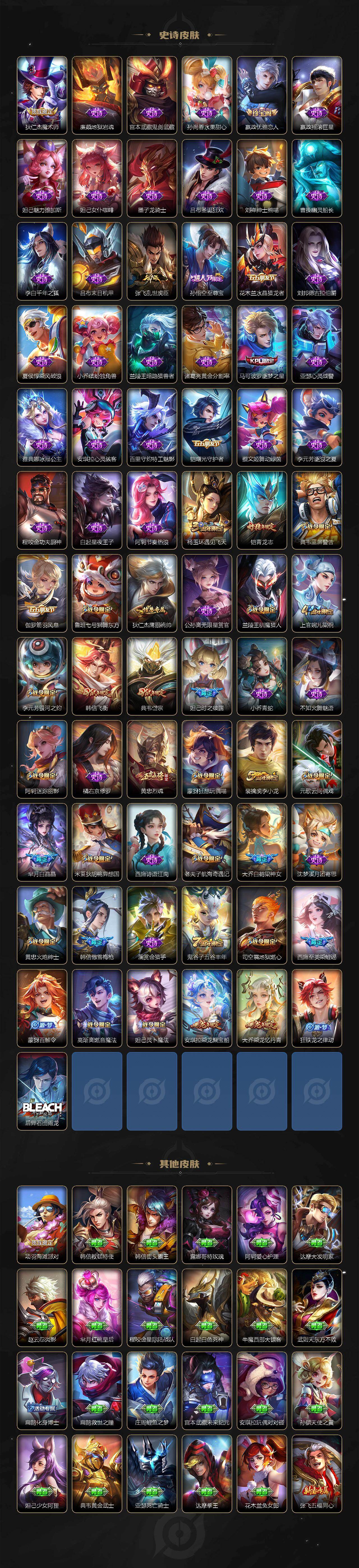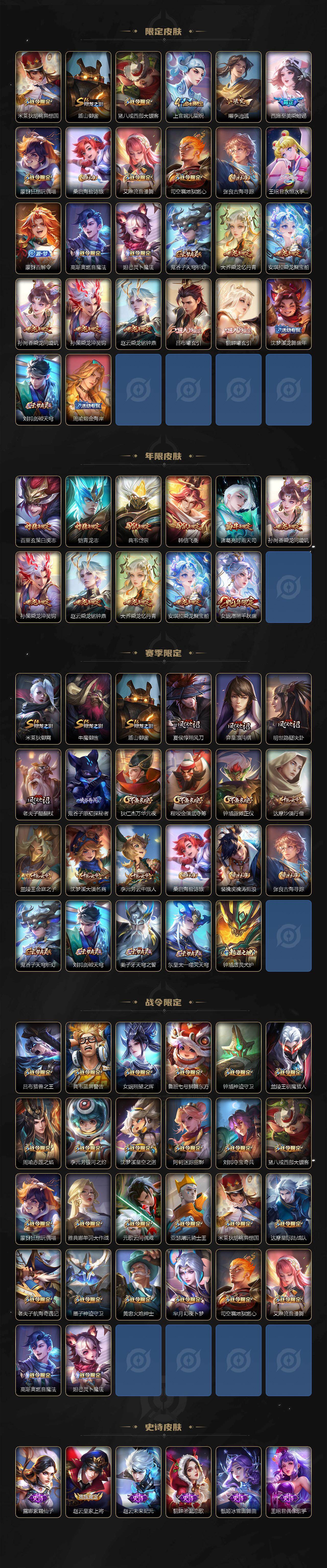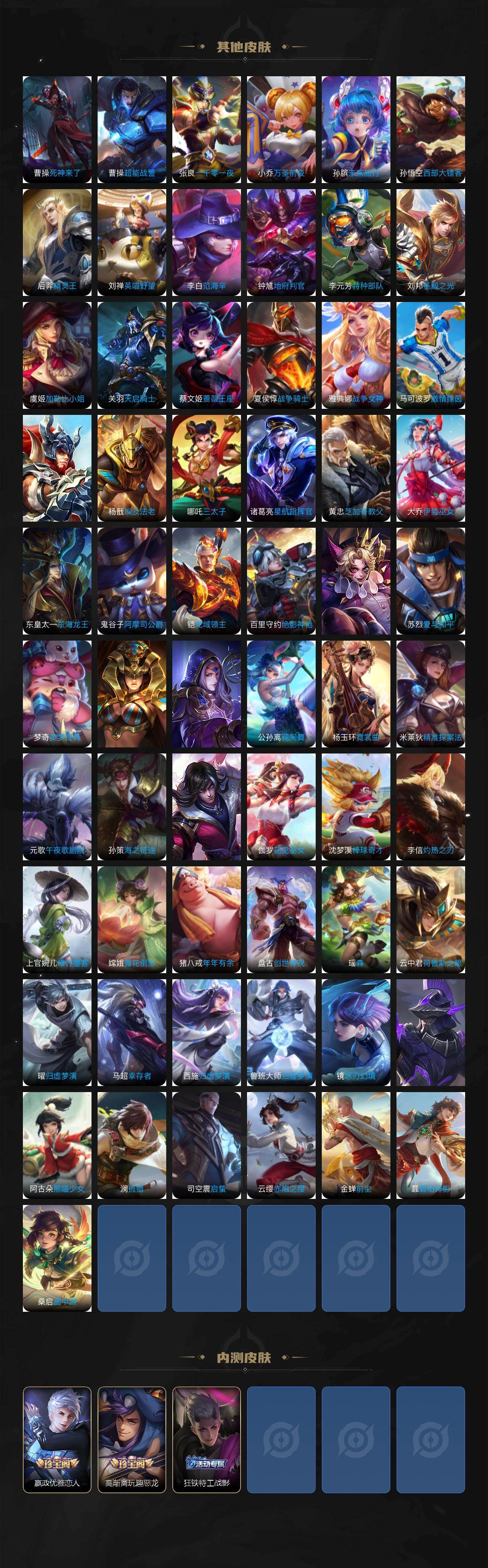 【传说皮肤】:女娲愿照千秋盛,云缨幻光神枪,桑启鸣野蒿,吕布曦玄引,貂蝉曦玄引,孙尚香乘龙问璇玑,孙策乘龙淬吴钩,赵云乘龙铭钟鼎,王昭君永恒水手月亮,吕布遇见神鼓,宫本武藏惊梅引,百里守约碎云,孙策末日机甲,赵云淬星耀世,曜李逍遥 ,小乔音你心动,李元芳飞鸢探春,诸葛亮时雨天司,铠绛天战甲,虞姬启明星使,孙悟空零号赤焰,李信一念神魔,张良黄金白羊座,