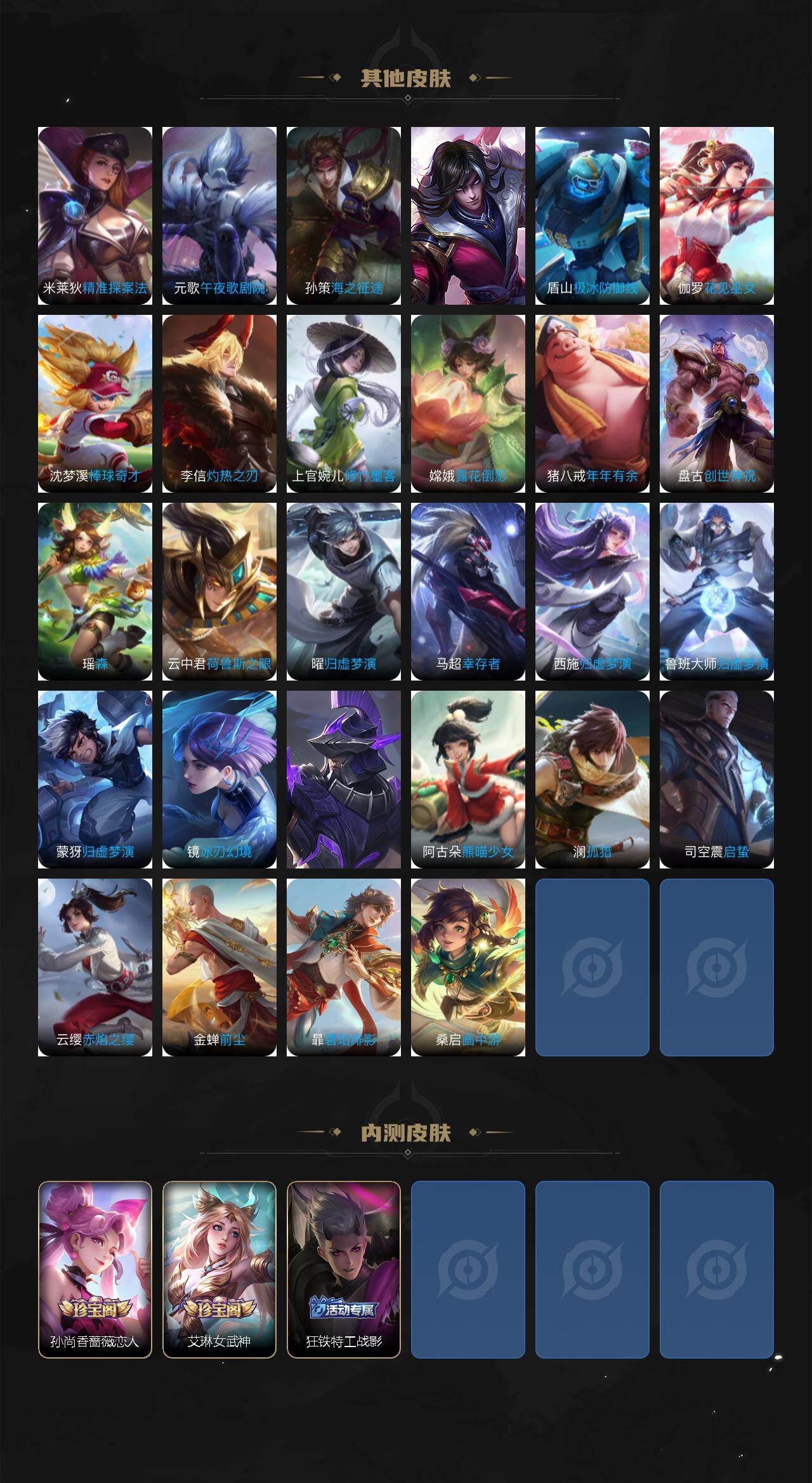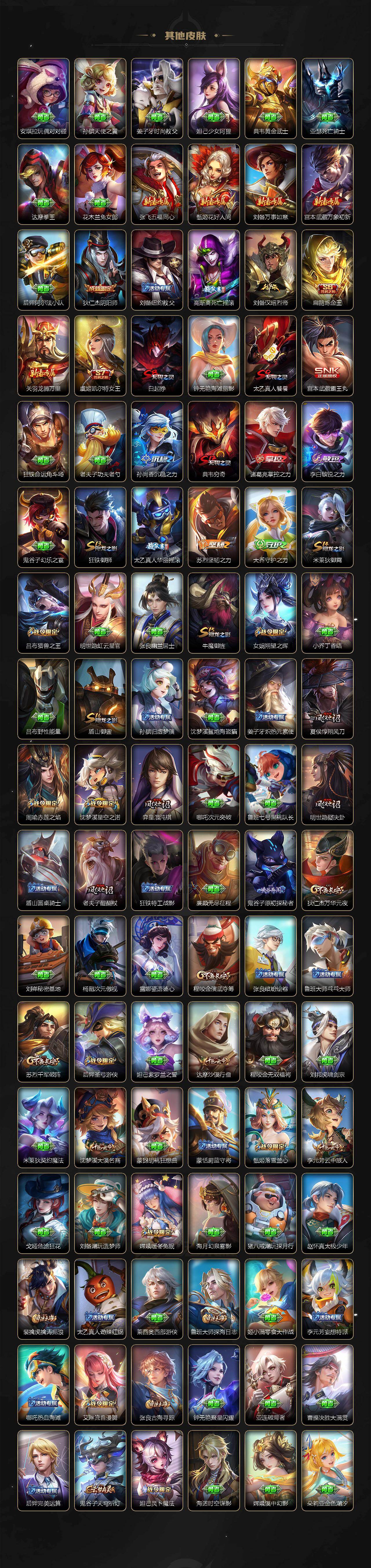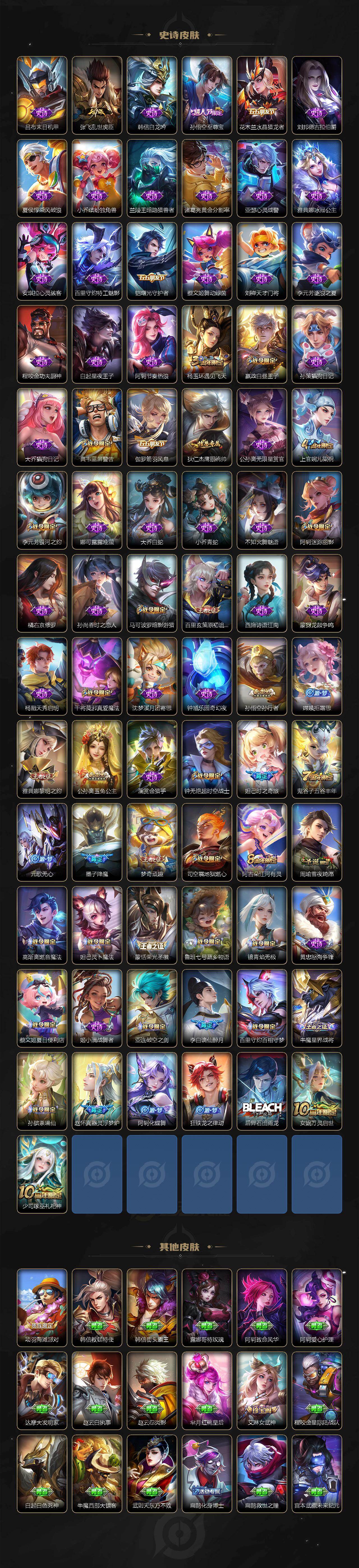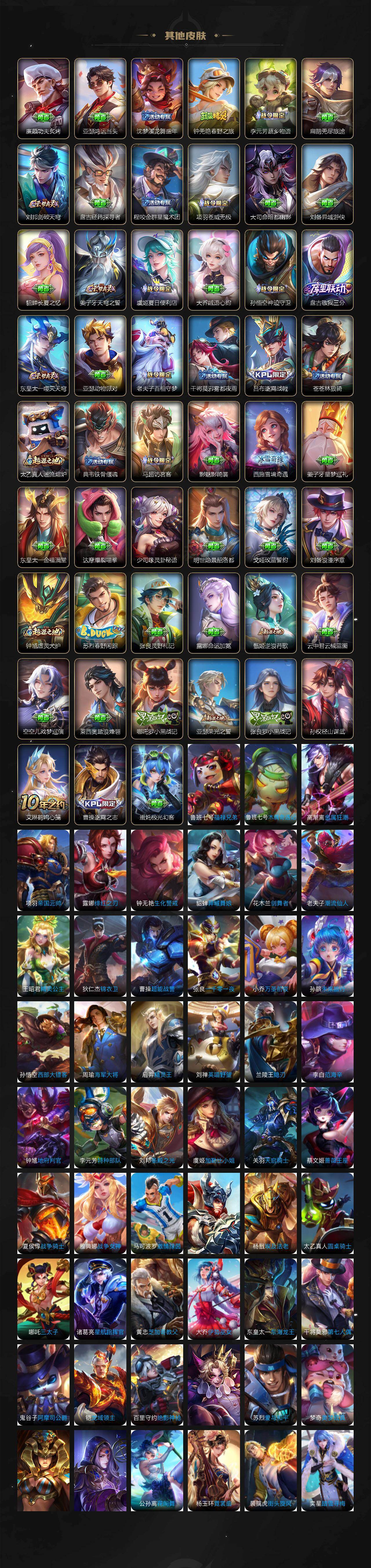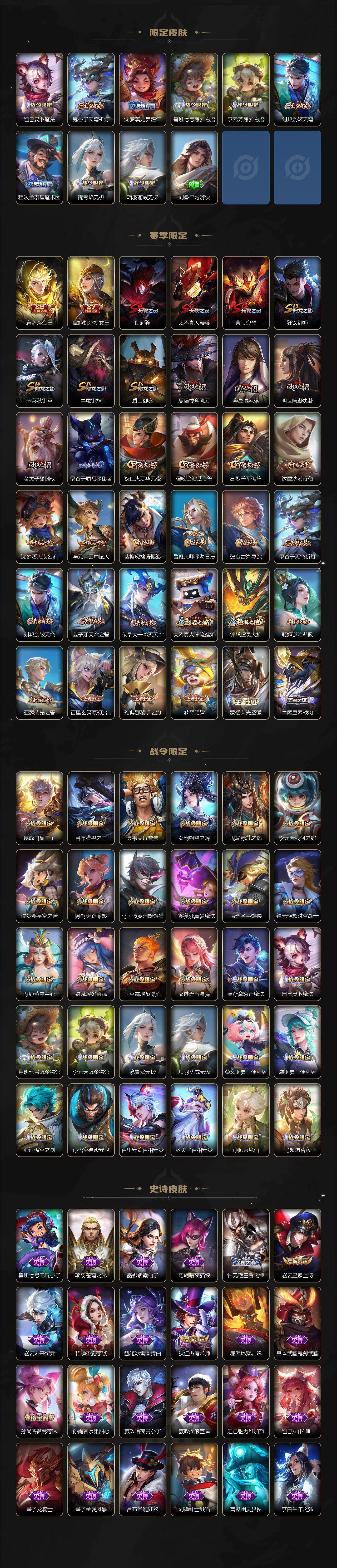 【传说皮肤】:后羿神树通天,桑启鸣野蒿,墨子黄金天蝎座,百里守约碎云,橘右京枫霜尽,娜可露露前尘镜,孙尚香音你闪耀,赵云淬星耀世,西施游龙清影,镜炽阳神光,虞姬启明星使,曜云鹰飞将,李信一念神魔,貂蝉猫影幻舞,干将莫邪久胜战神,达摩黄金狮子座,梦奇胖达荣荣,后羿黄金射手座,孙