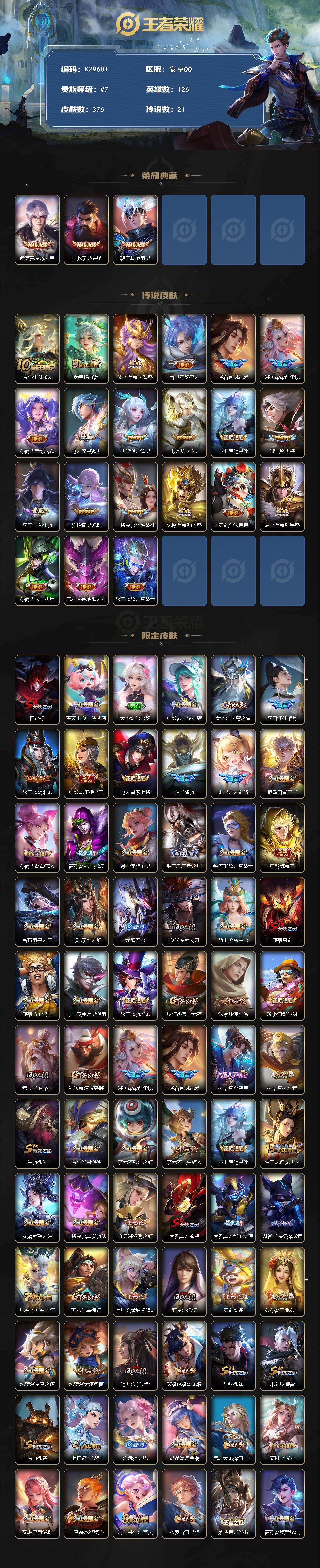 安卓Q-V7-最强王者段位-126英雄-376皮肤-3典藏皮肤-21传说-102史诗