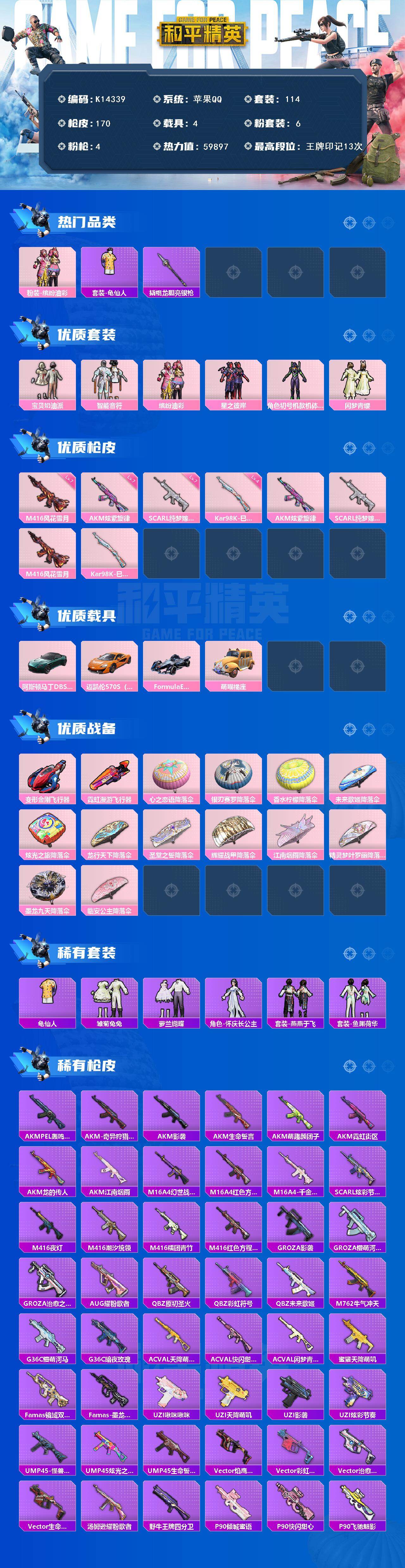 苹果 手Q-6粉装-4特效枪-4载具-3粉色飞行器-59897热力值-13王牌印记-114套装-170枪皮