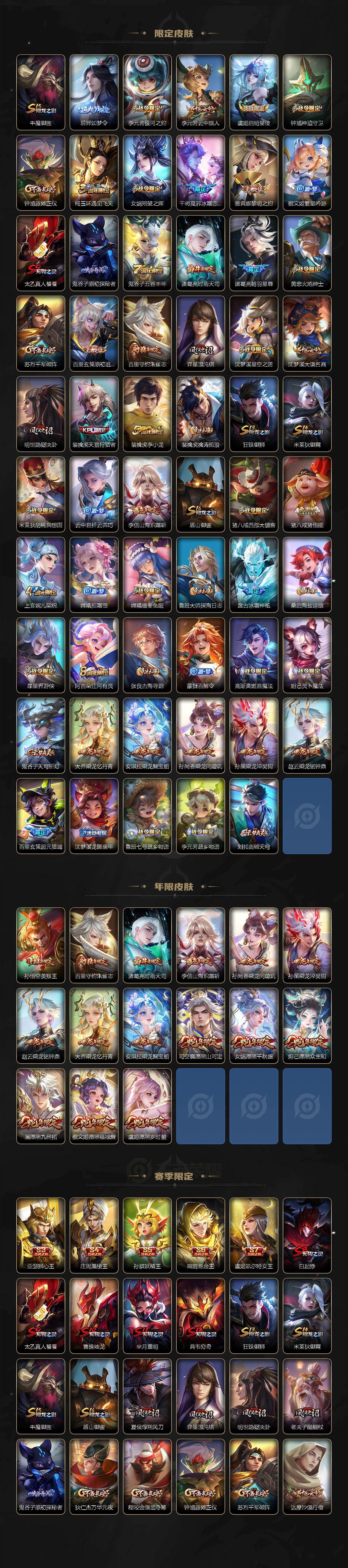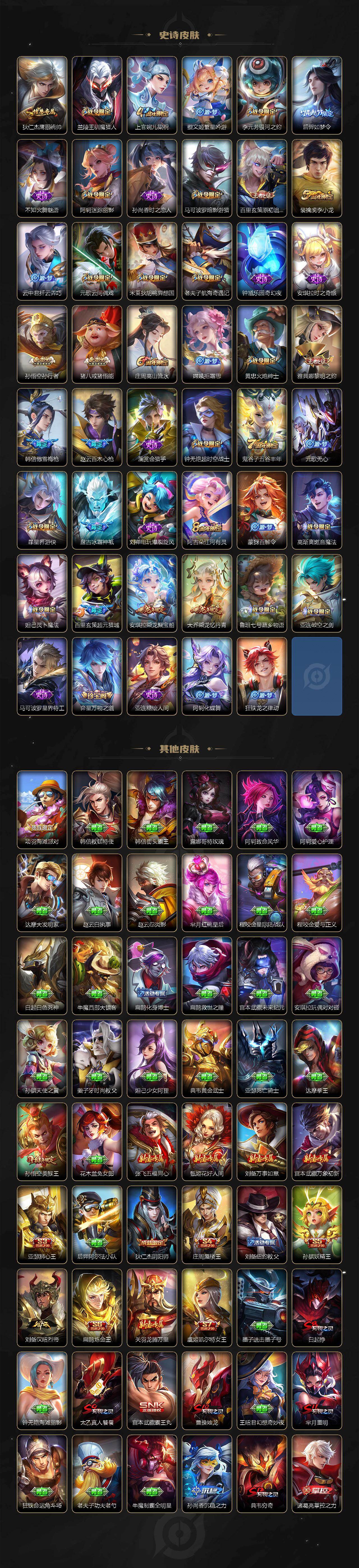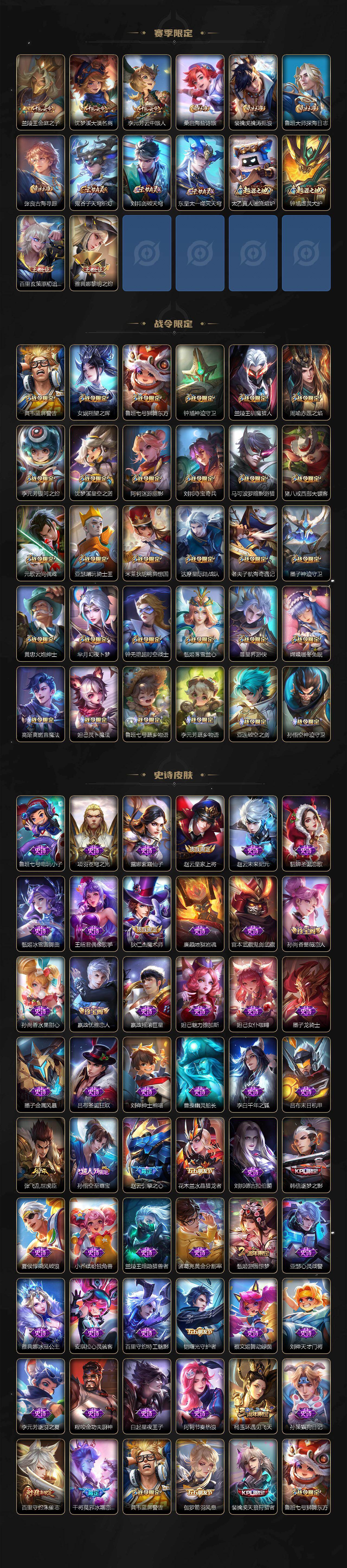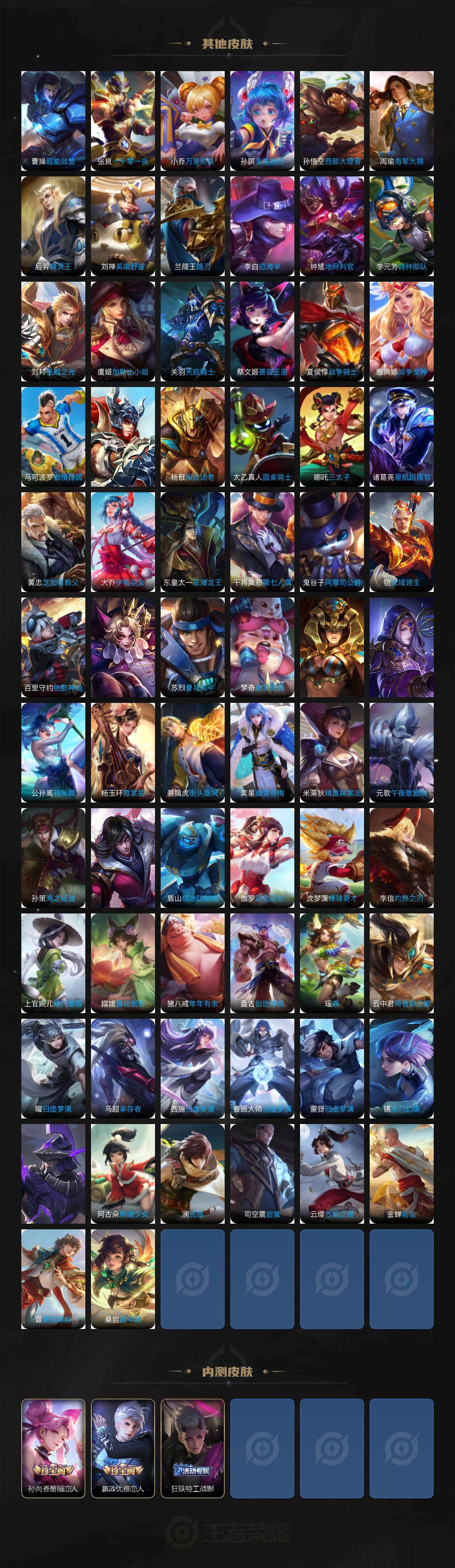 【传说皮肤】:后羿千劫归真,司空震愿照山河定,女娲愿照千秋盛,妲己愿照众生和,澜愿照九州拓,蔡文姬愿照福禄聚,虞姬愿照岁时盈,云缨幻光神枪,桑启鸣野蒿,孙尚香乘龙问璇玑,孙策乘龙淬吴钩,赵云乘龙铭钟鼎,澜逐花归