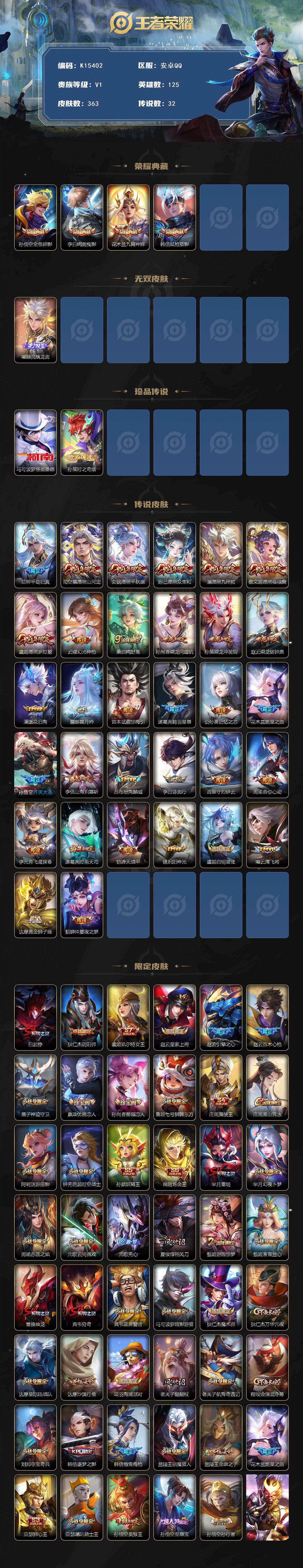 V1-最强王者段位-125英雄-363皮肤-4典藏皮肤-1无双-2珍品传