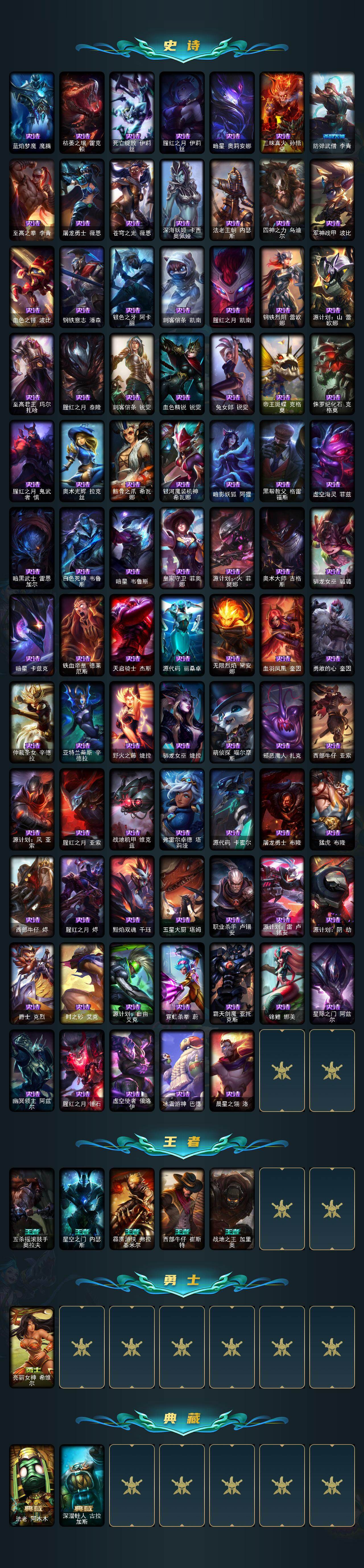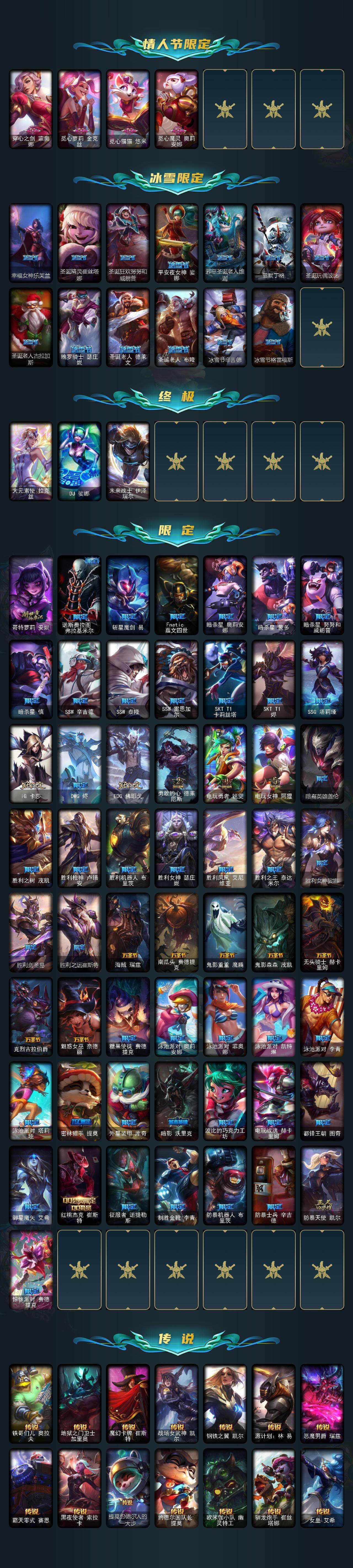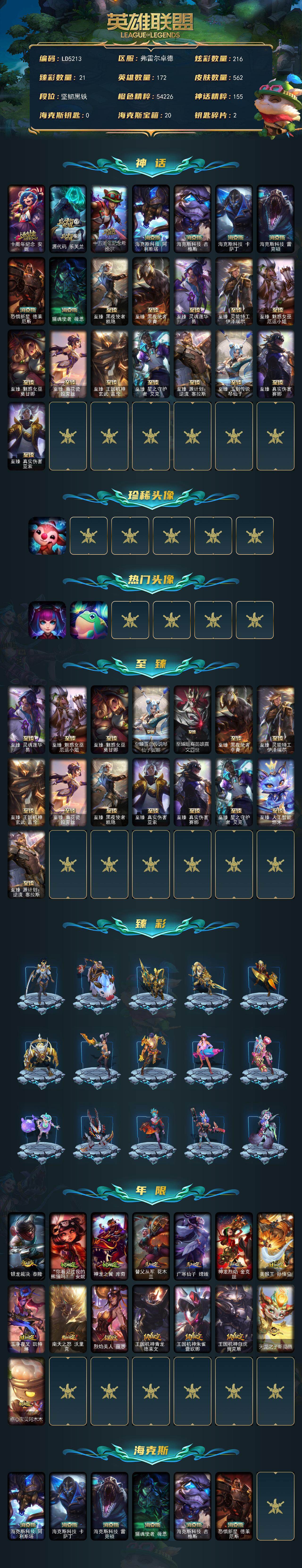 未定级段位-172英雄-562皮肤-216炫彩-3终极-24神话-89限定-72传说-124史诗