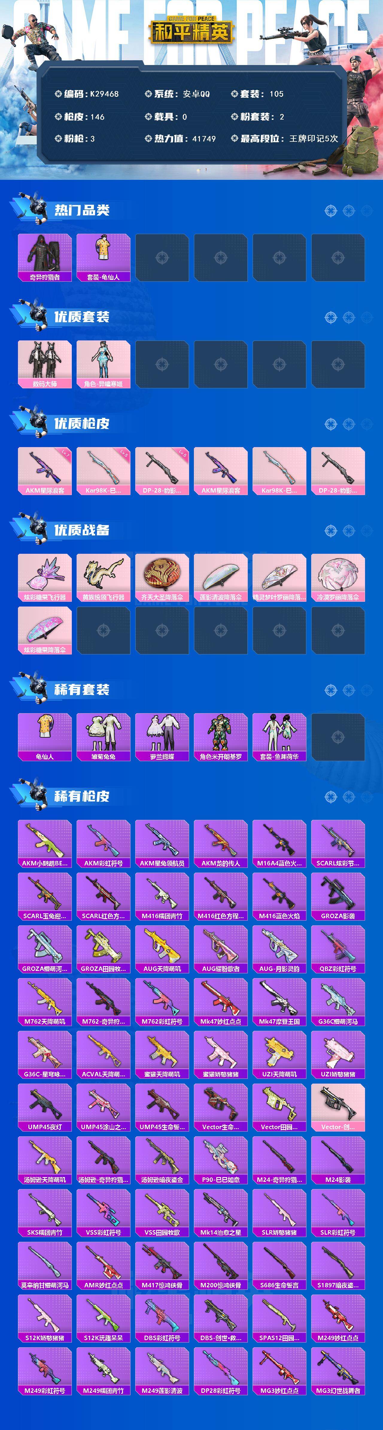 安卓 手Q-2粉装-3特效枪-0载具-2粉色飞行器-41749热力值-5王牌印记-105套装-146枪皮
