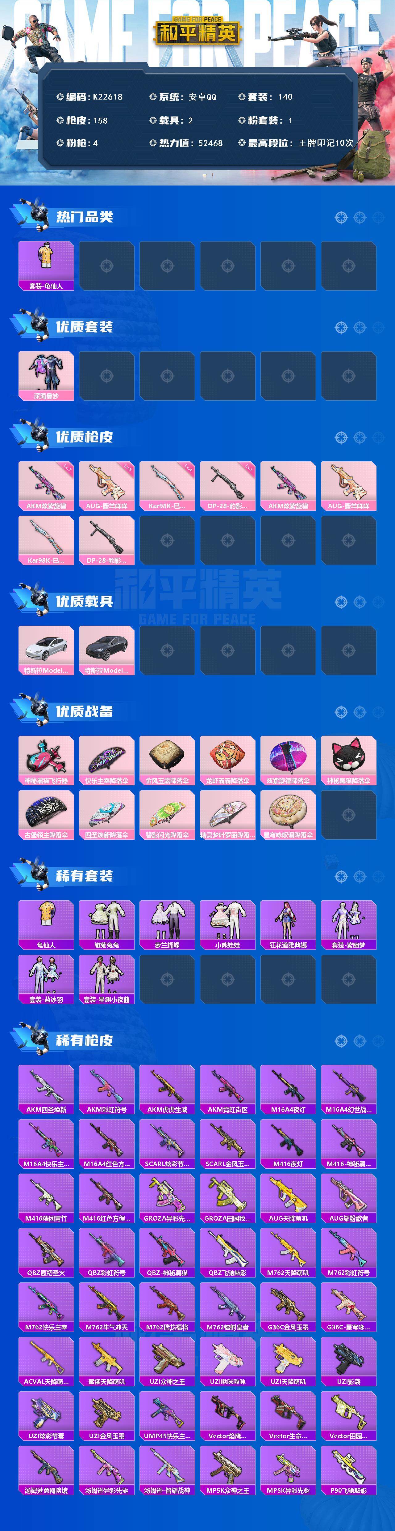 安卓 手Q-1粉装-4特效枪-2载具-1粉色飞行器-52468热力值-10王牌印记-140套装-158枪皮