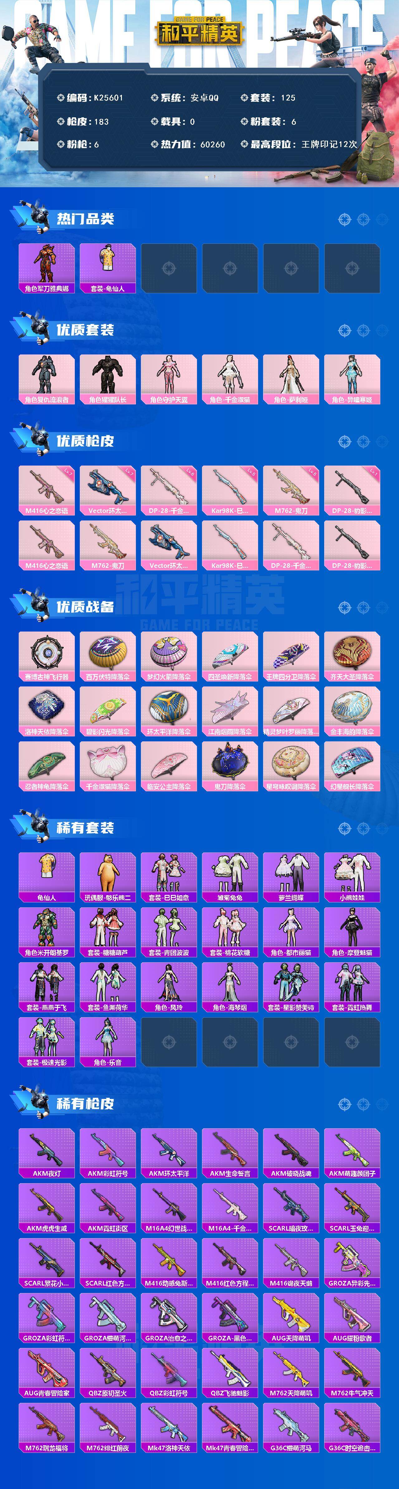 安卓 手Q-6粉装-6特效枪-0载具-1粉色飞行器-60260热力值-12王牌印记-125套装-183枪皮