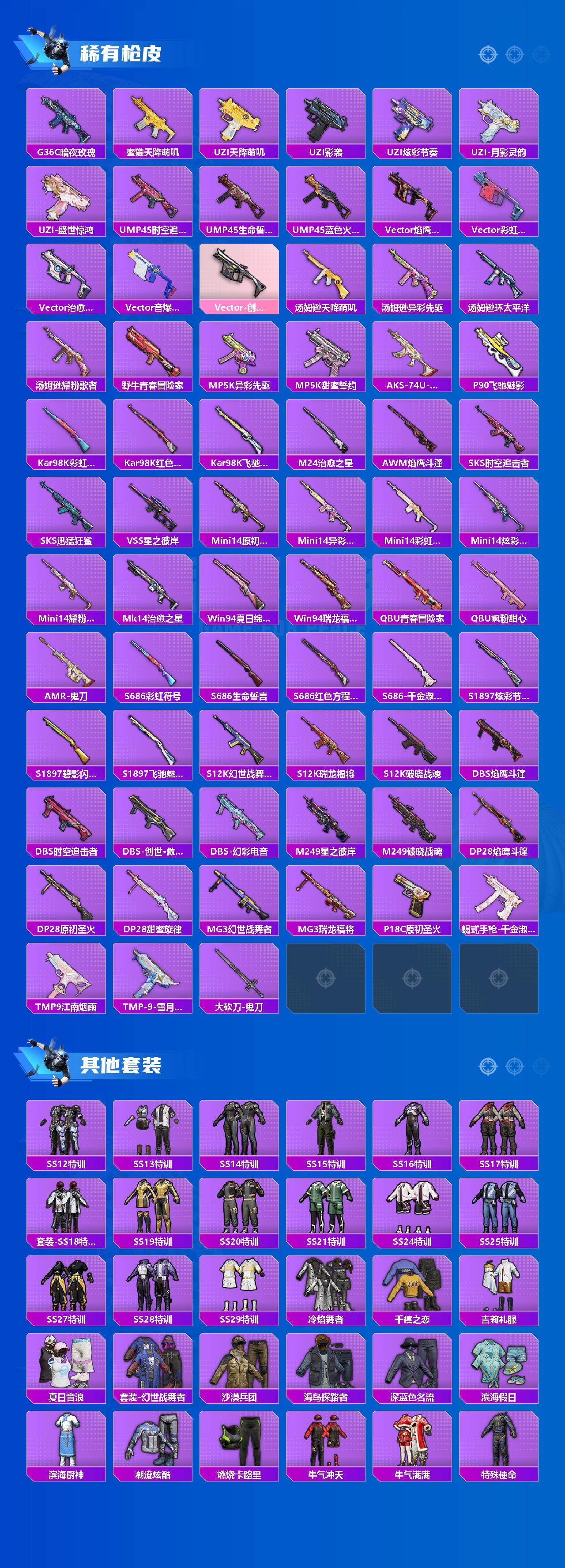【粉色枪皮等级】:M416-心之恋语(七级),M762-鬼刀(五级),Vector-环太平洋(七级),Kar98K-巳巳如意(五级),DP-28-千金淑猫(六级),DP-28-豹影疾电(一级)