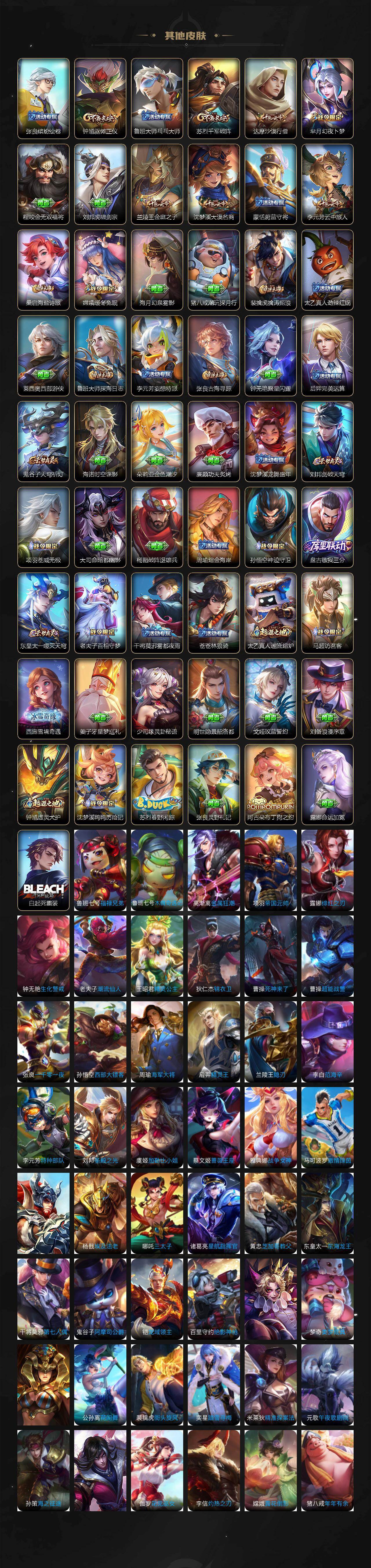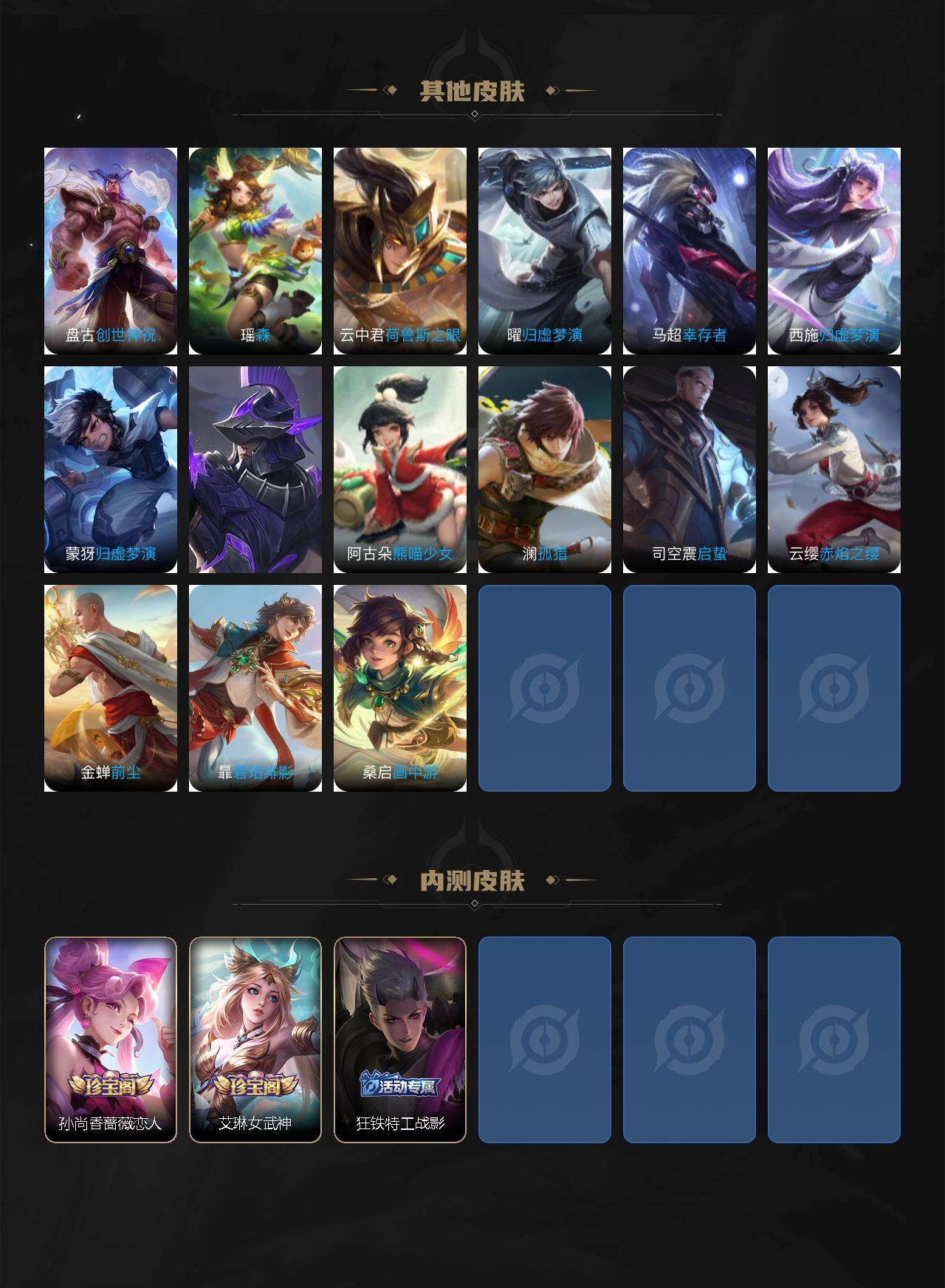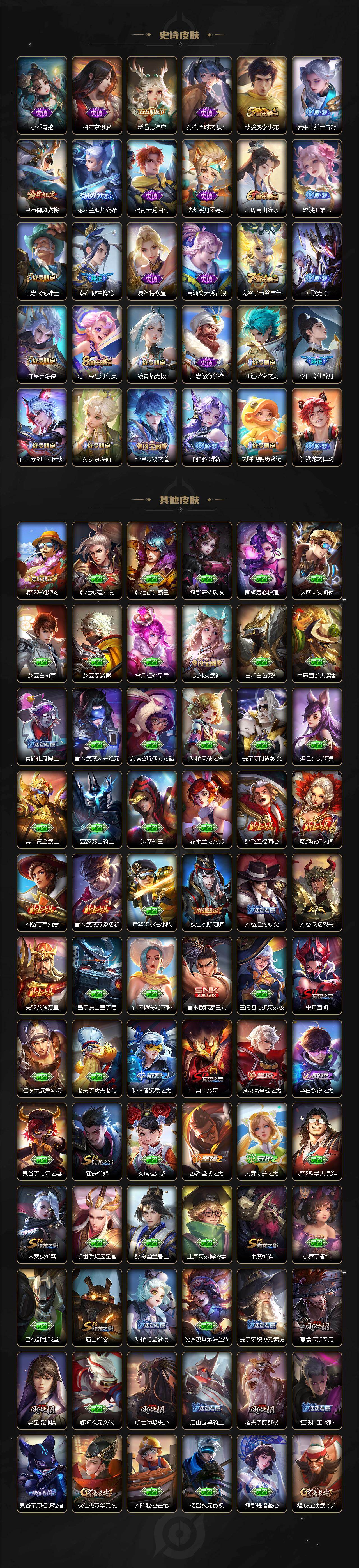 【传说皮肤】:司空震愿照山河定,女娲愿照千秋盛,妲己愿照众生和,澜愿照九州拓,虞姬愿照岁时盈,云缨幻光神枪,桑启鸣野蒿,澜逐花归海,吕布怒海麟威,李白诗剑行,马超无双飞将,孙策末日机甲,赵云淬星耀世,曜李逍遥 ,镜炽阳神光,虞姬启明星使,曜云鹰飞将,貂蝉猫影幻舞,后羿黄金射手座,貂蝉仲夏夜之梦,宫本武藏地狱之眼