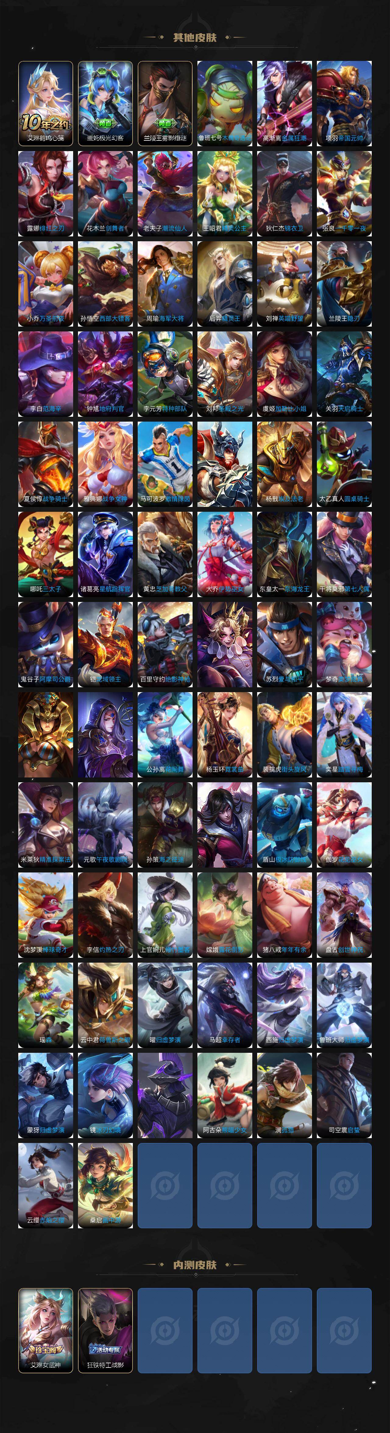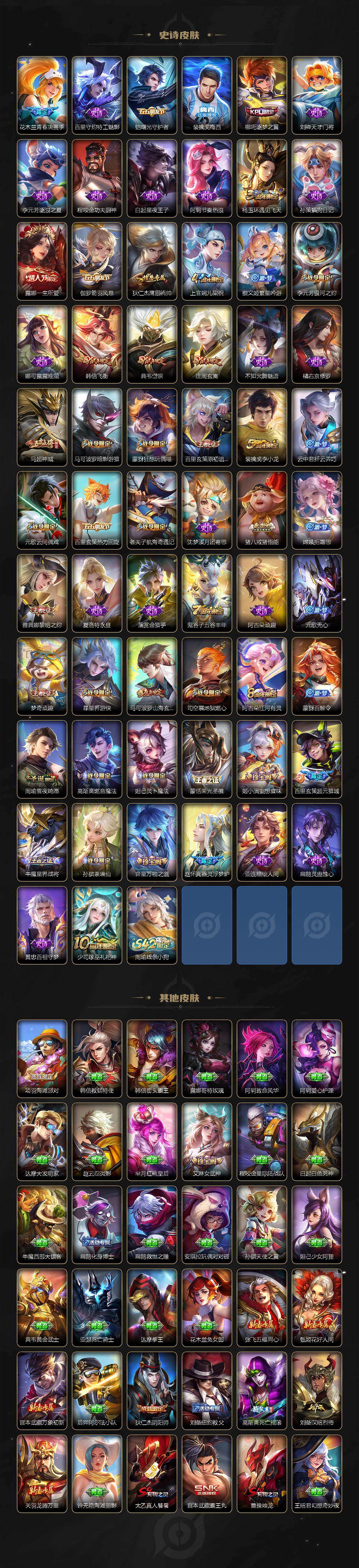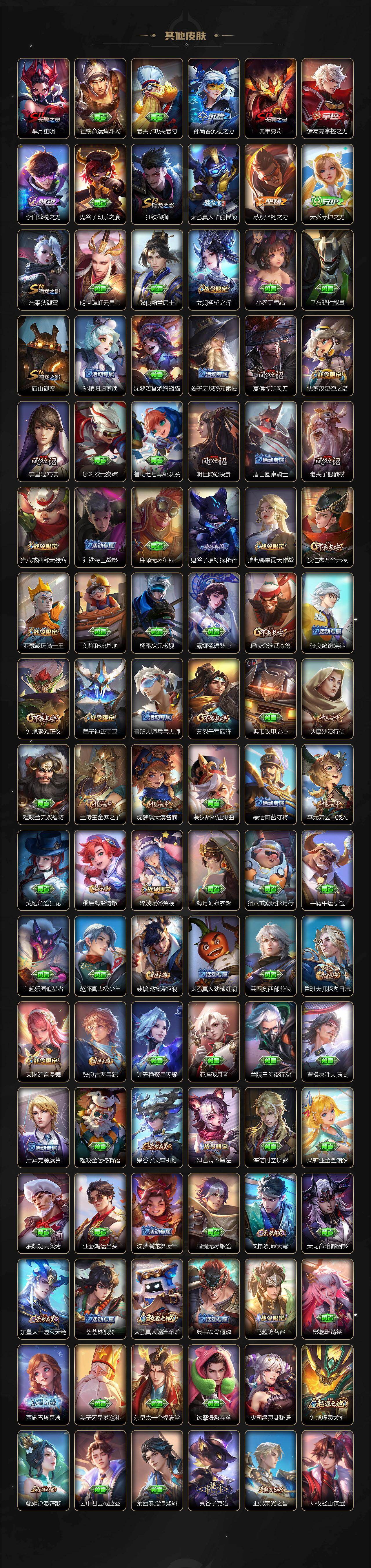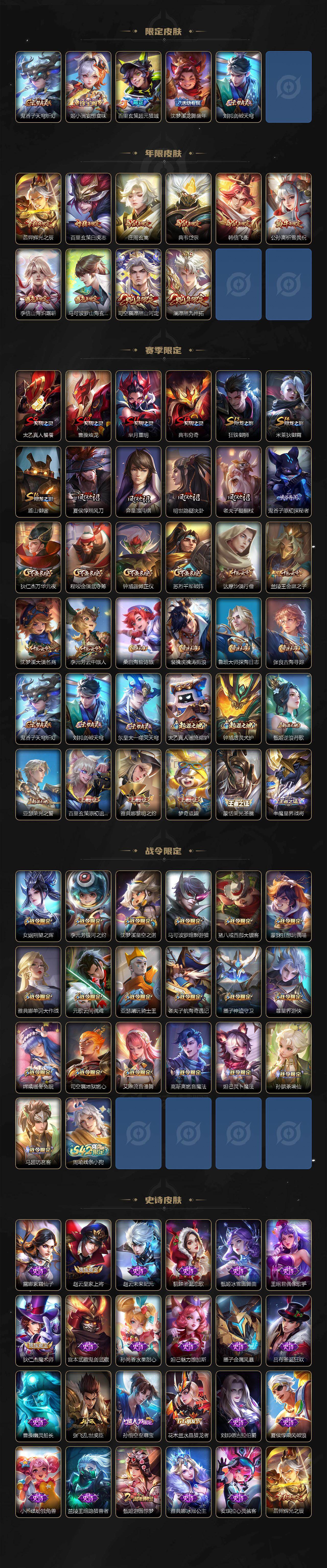 【传说皮肤】:后羿神树通天,司空震愿照山河定,澜愿照九州拓,云缨幻光神枪,桑启鸣野蒿,澜逐花归海,露娜霜月吟,李信山海炽霜斩,公孙离祈雪灵祝,镜炽阳神光,虞姬启明星使,李信一念神魔,百里玄策白虎志,梦奇胖达荣荣,孙尚香末日机甲,宫本武藏地狱之眼