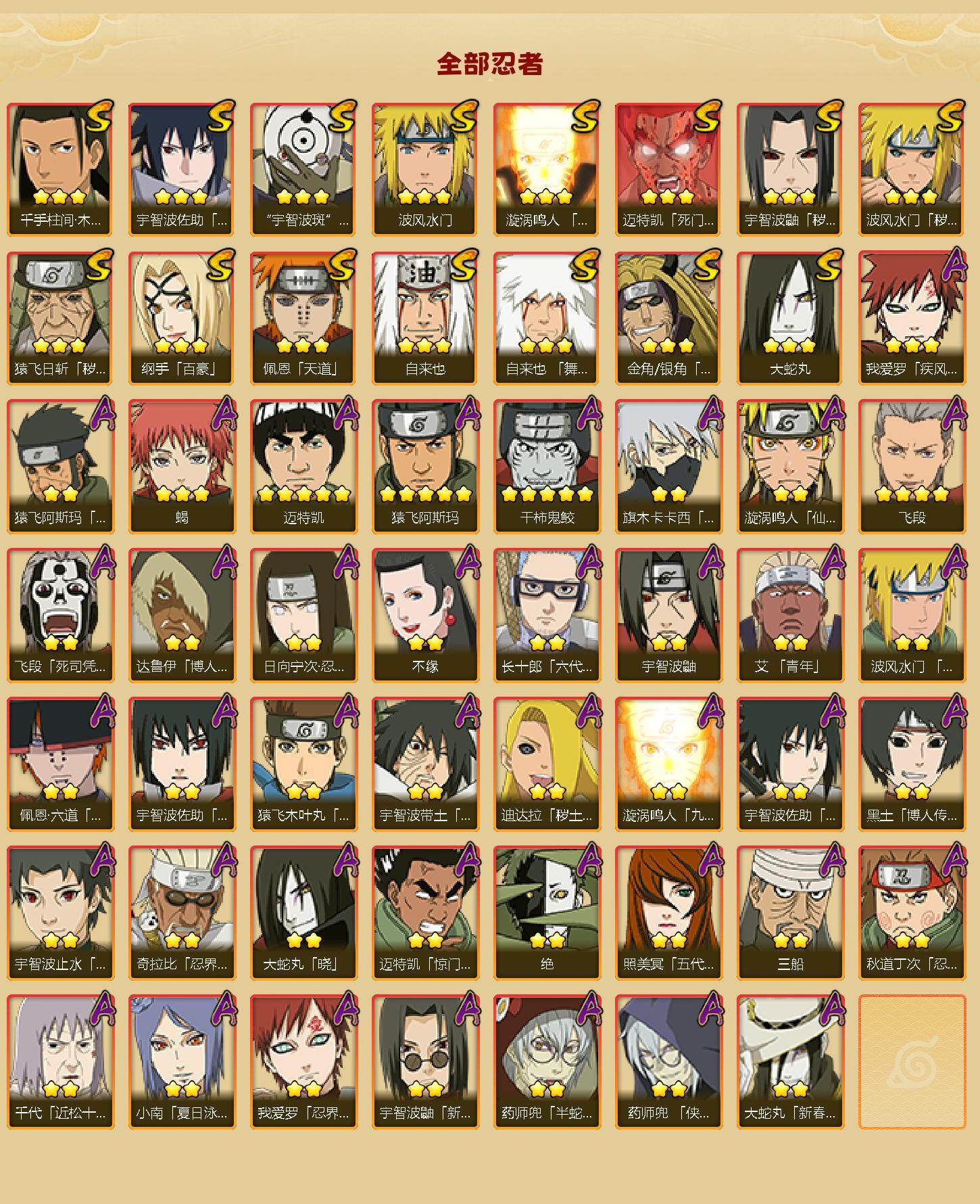 【S级忍者】:金角·银角「秽土转生」(3星),猿飞日斩「秽土转生」(3星),波风水门「秽土转生」(3星),宇智波鼬「秽土转生」(3星),千手柱间「木叶创立」(3星),自来也(3星),自来也「舞之豪杰」(3星),大蛇丸(3星),纲手「百豪」(3星),波风水门(3星),漩涡鸣人「九喇嘛连结」(3星),迈特凯「死门」(3星),佩恩「天道」(3星),宇智波佐助「永恒万花筒」(3星),宇智波斑 「白面具」(3星宇智波斑「白面具」)