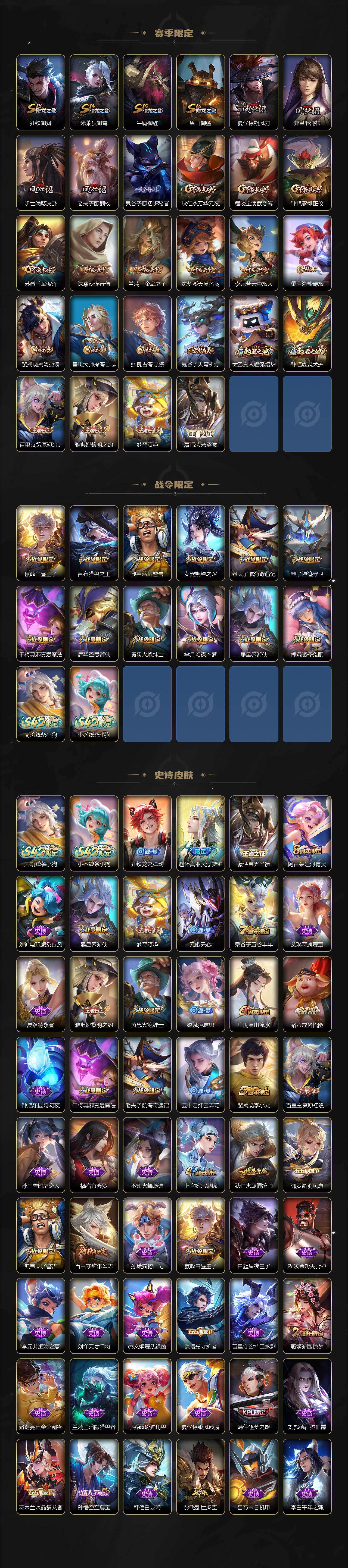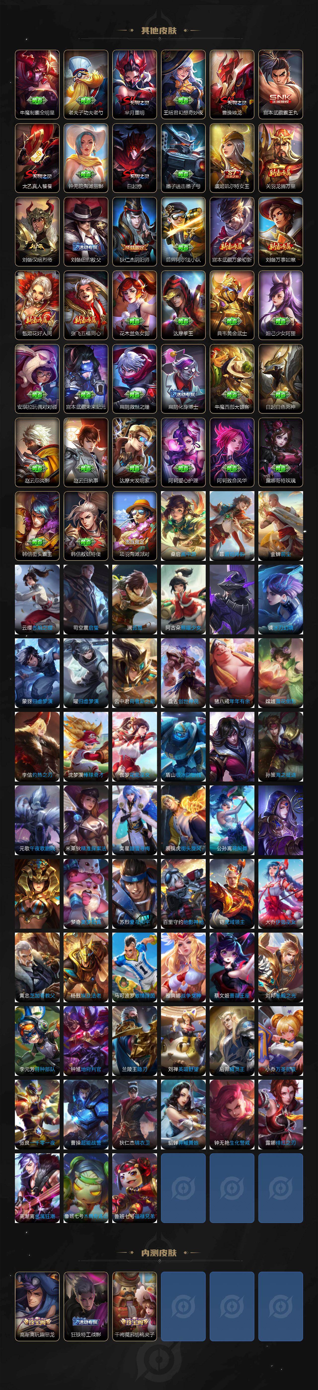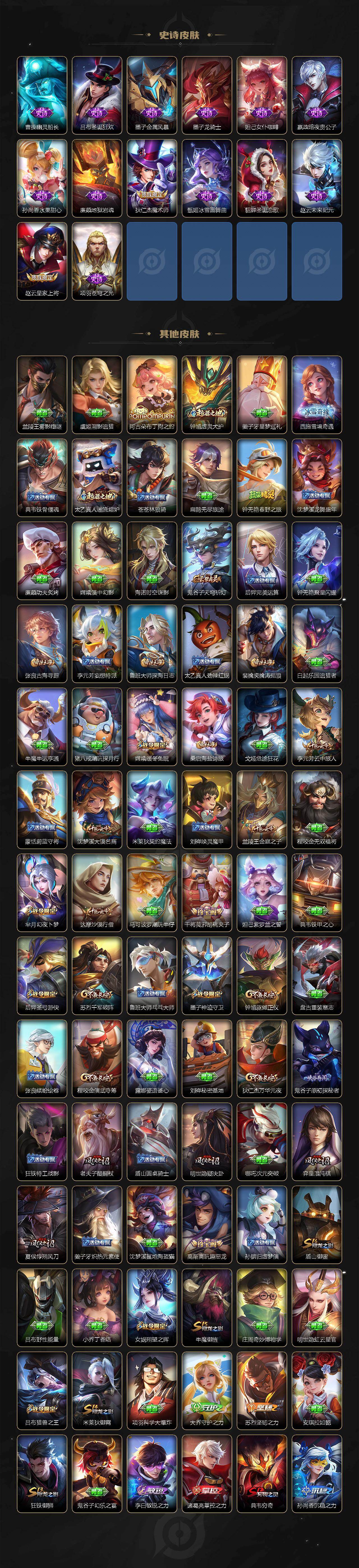 【限定皮肤】:白起狰,狄仁杰阴阳师,虞姬凯尔特女王,赵云皇家上将,墨子神迹守卫,嬴政白昼王子,孙尚香异界灵契,庄周高山流水,高渐离玩趣恶龙,芈月重明,芈月幻夜卜梦,吕布猎兽之王,元歌无心,夏侯惇朔风刀,甄姬游园惊梦,曹操烛