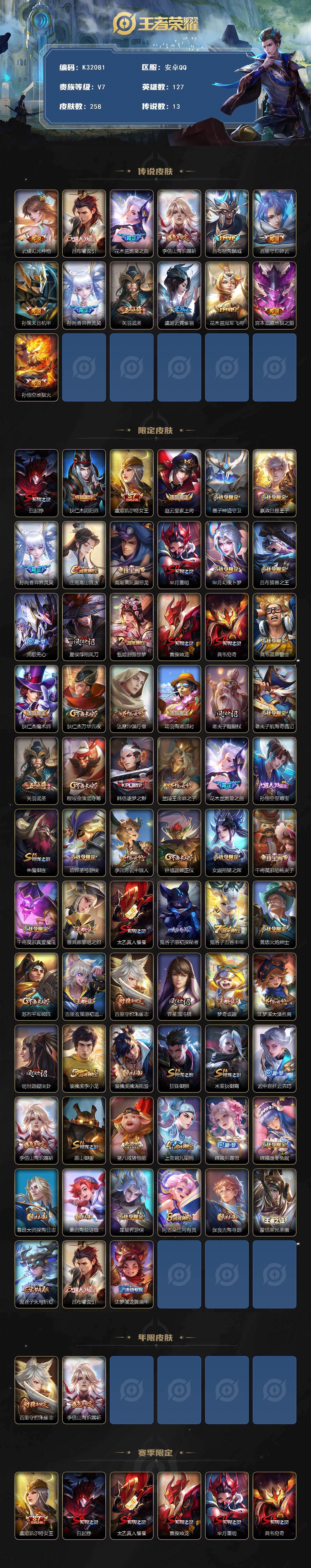 安卓Q-V7-永恒钻石II段位-127英雄-258皮肤-13传说-67史诗