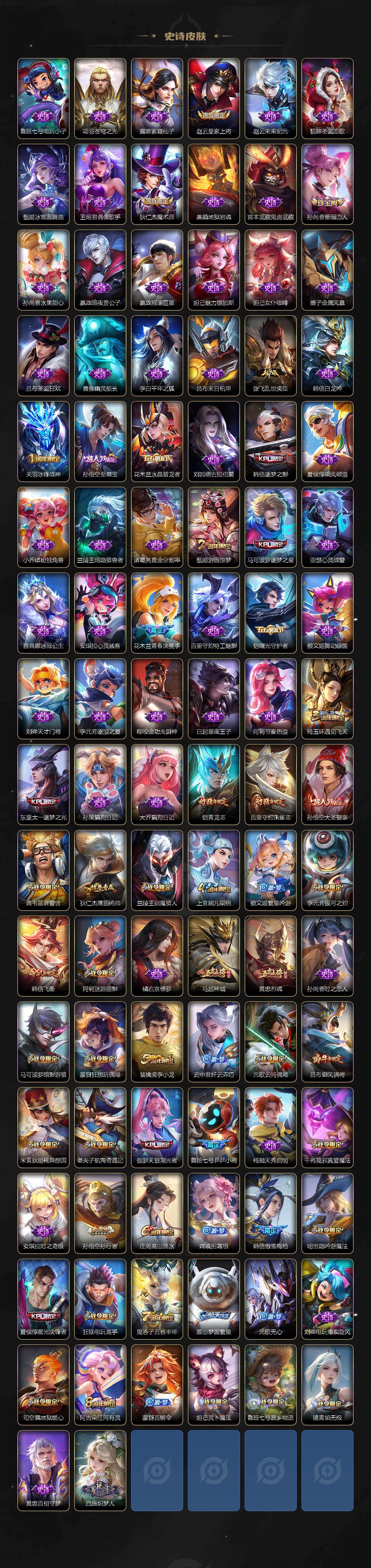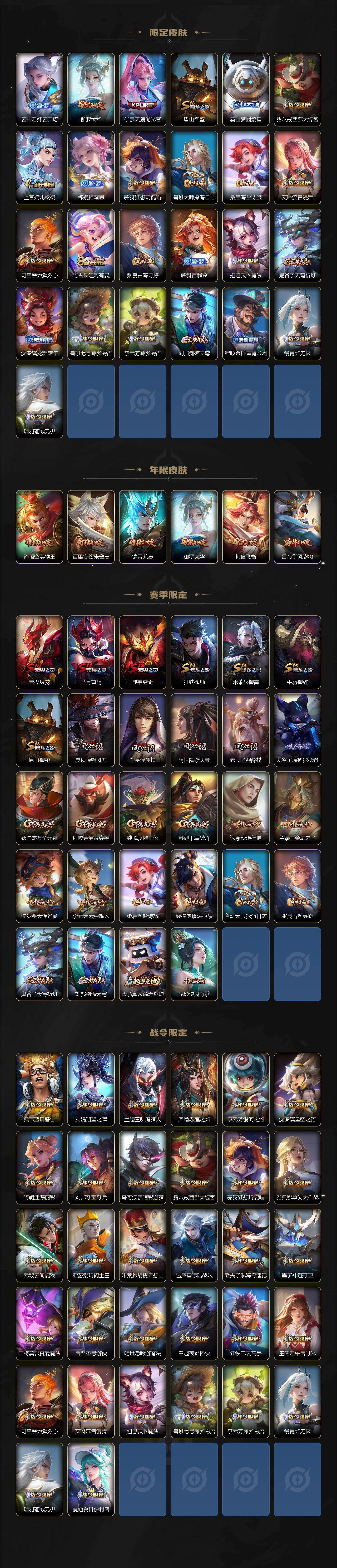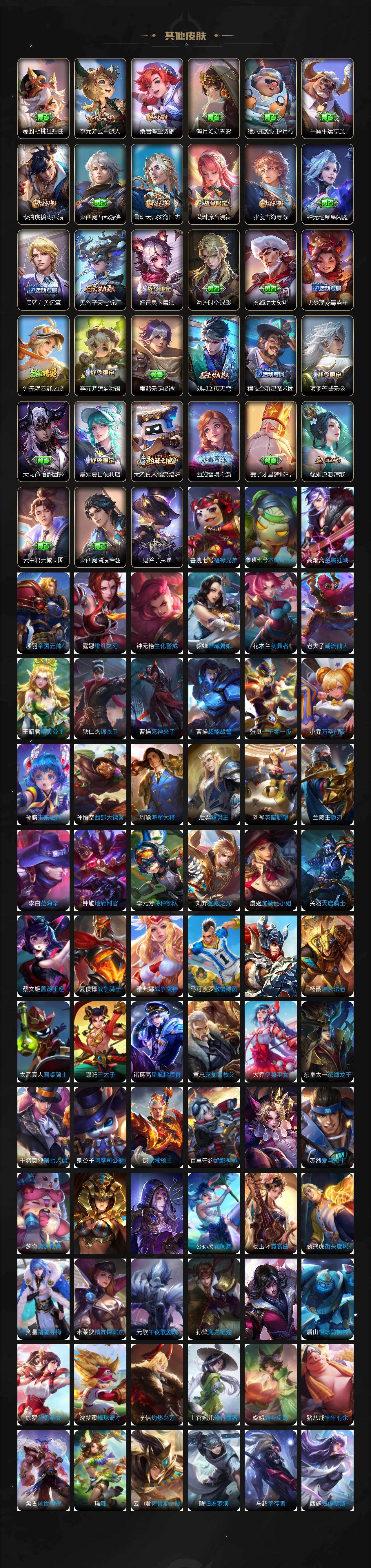【传说皮肤】:云缨幻光神枪,孙尚香异界灵契,赵云淬星耀世,铠绛天战甲,虞姬启明星使,孙悟空零号赤焰,李信一念神魔,伽罗太华,达摩黄金狮子座,后羿黄金射手座,诸葛亮武陵仙君,孙尚香末日机甲,宫本武藏地狱之眼,孙悟空地狱火,吕布天魔缭乱