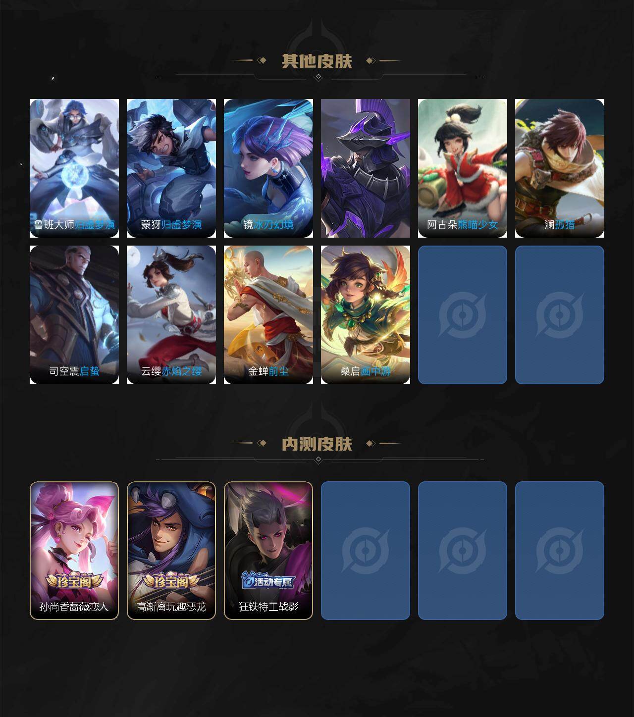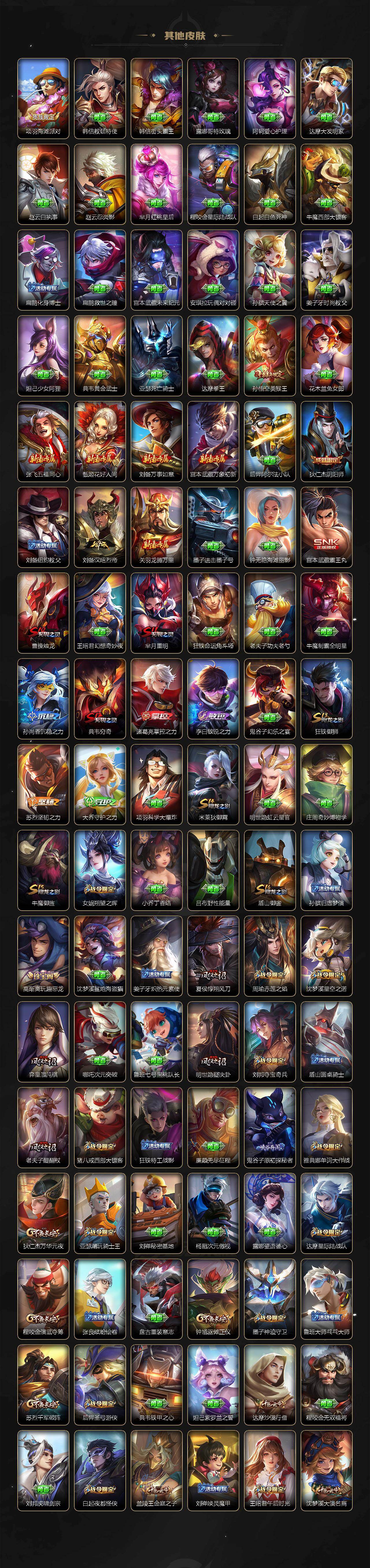 【限定皮肤】:虞姬夏日便利店,狄仁杰阴阳师,赵云皇家上将,墨子神迹守卫,孙尚香蔷薇恋人,孙尚香异界灵契,鲁班七号乒乒
