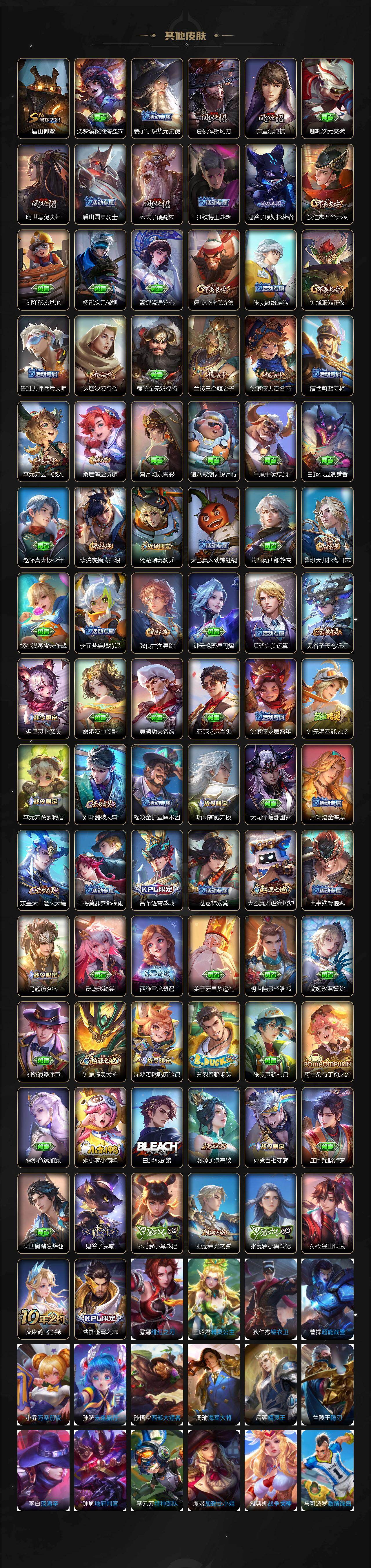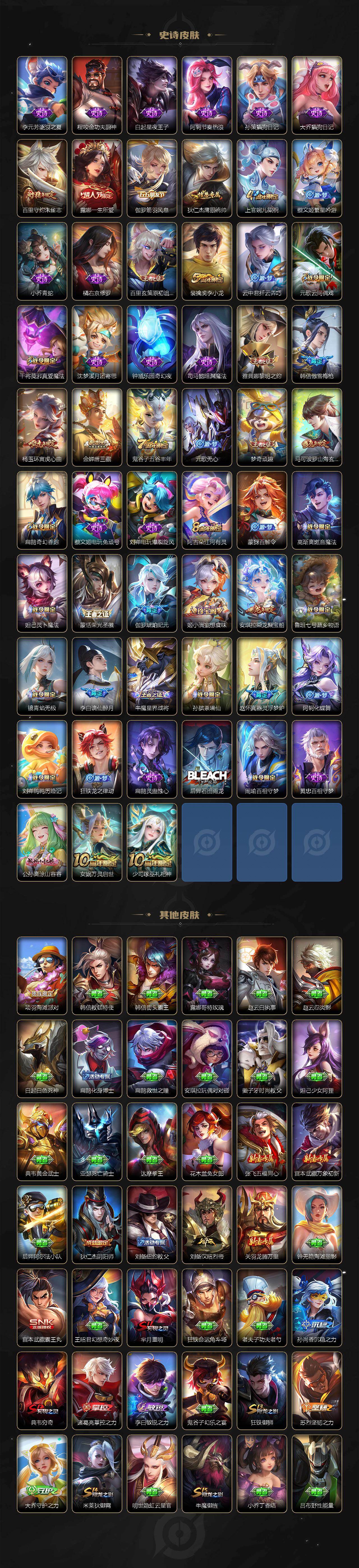 【传说皮肤】:后羿神树通天,干将莫邪千山共赴,女娲愿照千秋盛,妲己愿照众生和,桑启鸣野蒿,吕布曦玄引,李白诗剑行,马超无双飞将,孙策挚爱之约,孙策末日机甲,鲁班七号寅虎瑞焰,诸葛亮时雨天司,孙悟空零号赤焰,李信一念神魔,貂蝉仲夏夜之梦,狄仁杰超时空战士
