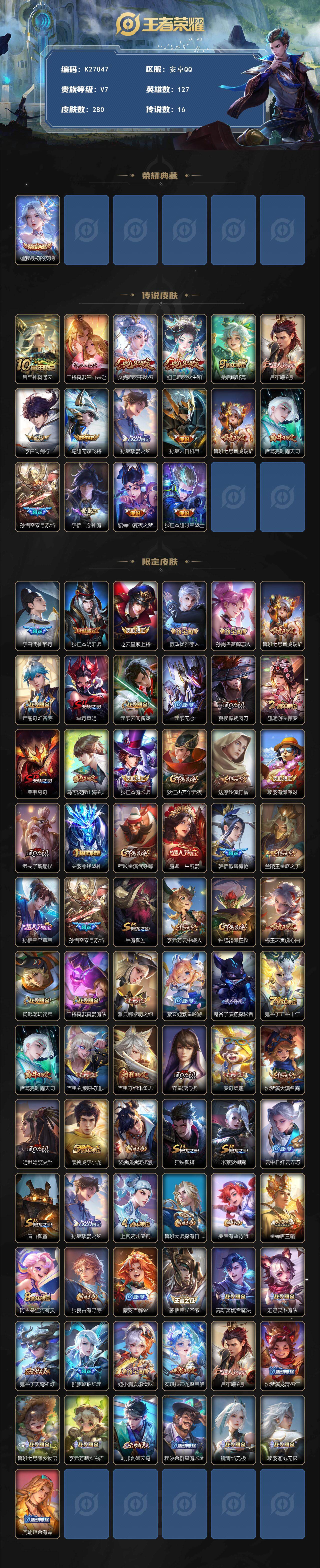 安卓Q-V7-最强王者段位-127英雄-280皮肤-1典藏皮肤-16传说-92史诗