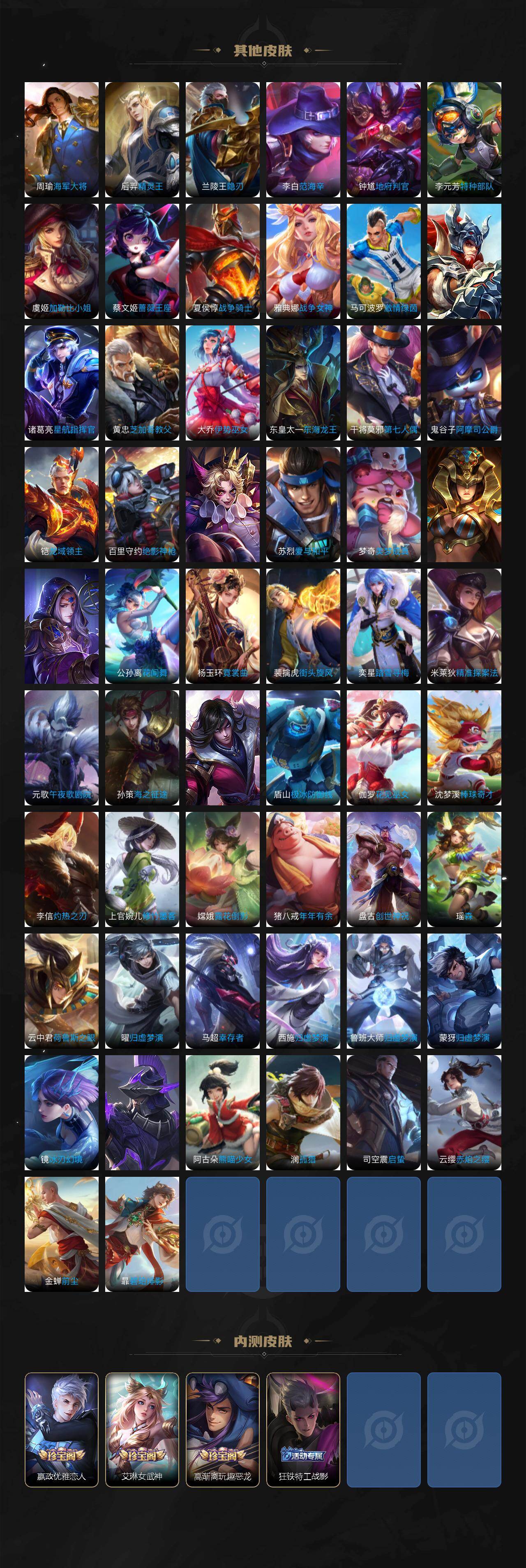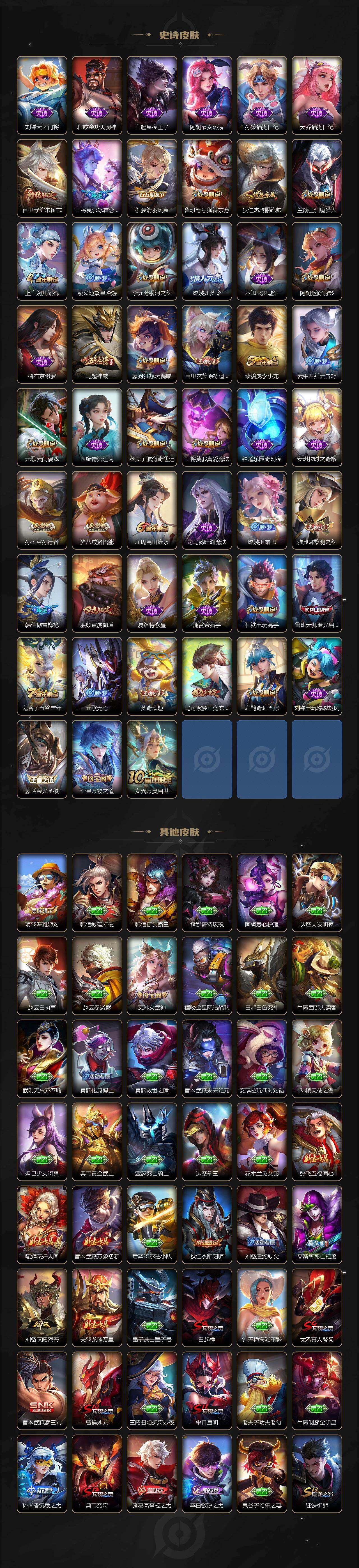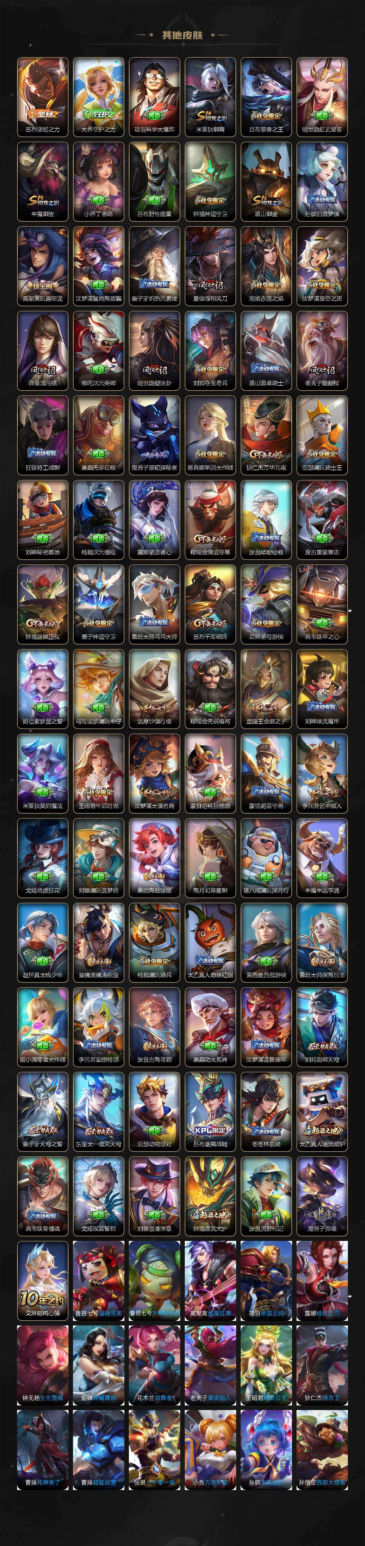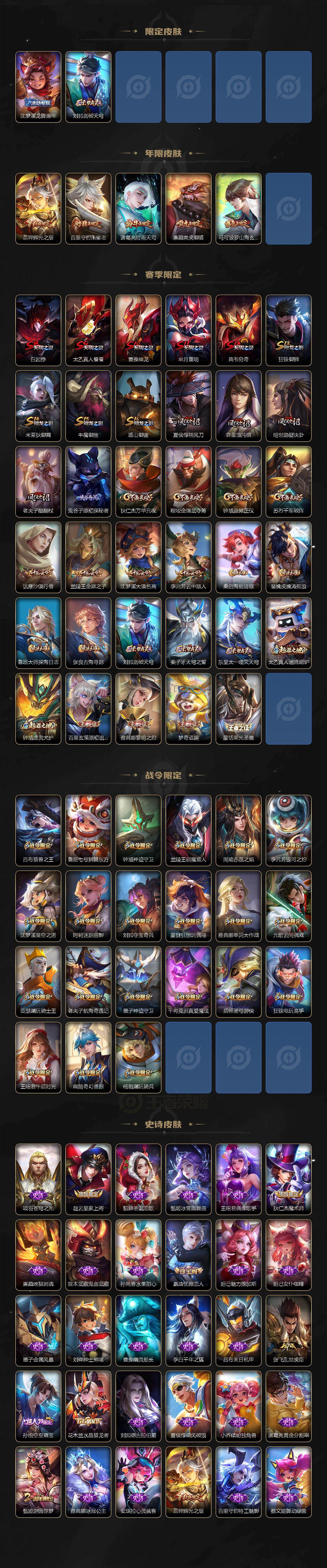【限定皮肤】:白起狰,姜子牙天穹之誓,狄仁杰阴阳师,廉颇寅虎御盾,赵云皇家上将,墨子神迹守卫,嬴政优雅恋人,鲁班七号狮舞东方,庄周高山流水,高渐离死亡摇滚,高渐离玩趣恶龙,阿轲迷踪