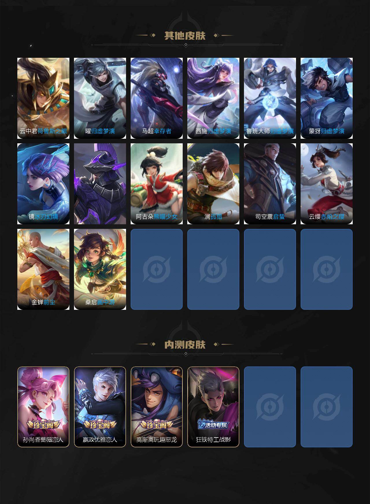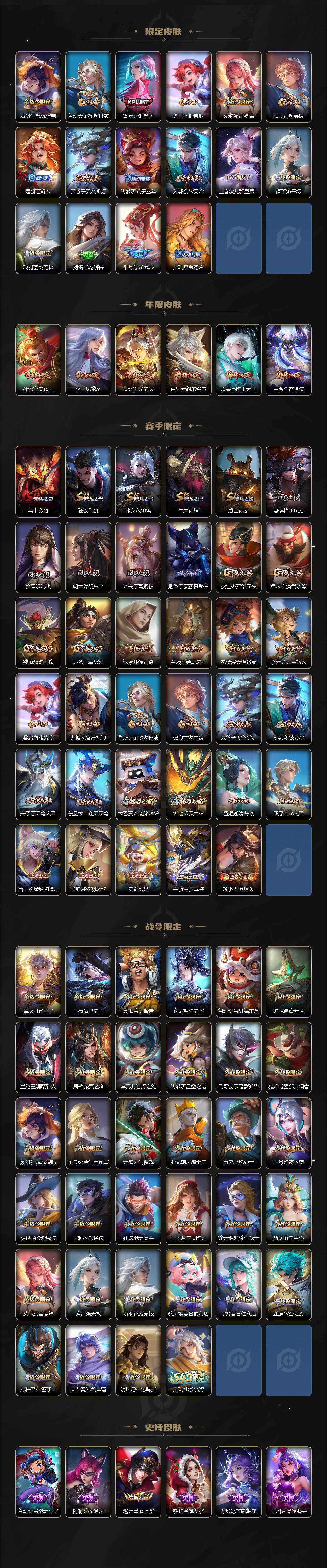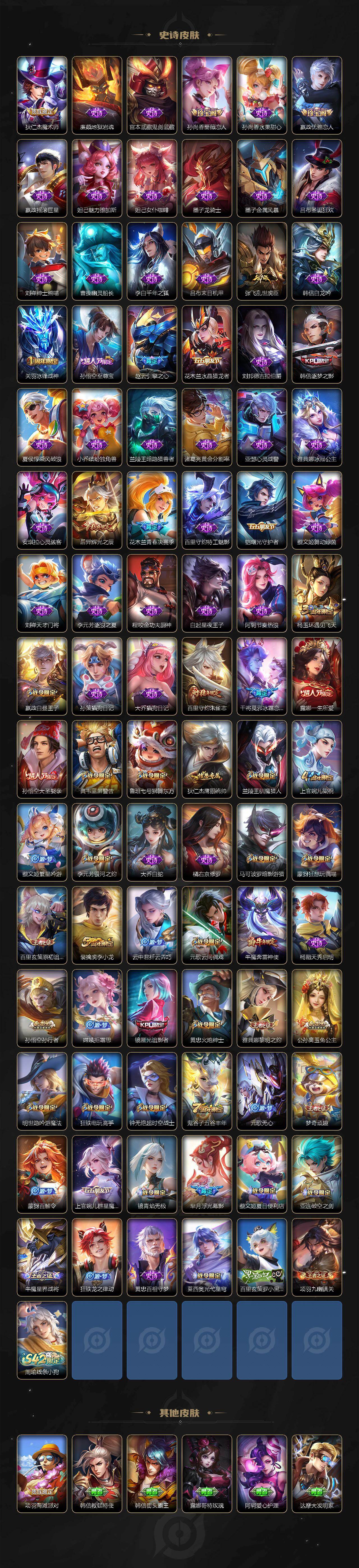 【传说皮肤】:桑启鸣野蒿,夏侯惇霜北刀,孙策挚爱之约,诸葛亮时雨天司,镜炽阳神光,虞姬启明星使,后羿黄金射手座,李白凤求凰,孙尚香末日机甲,宫本武藏地狱之眼,孙悟空地狱火,吕布天魔缭乱